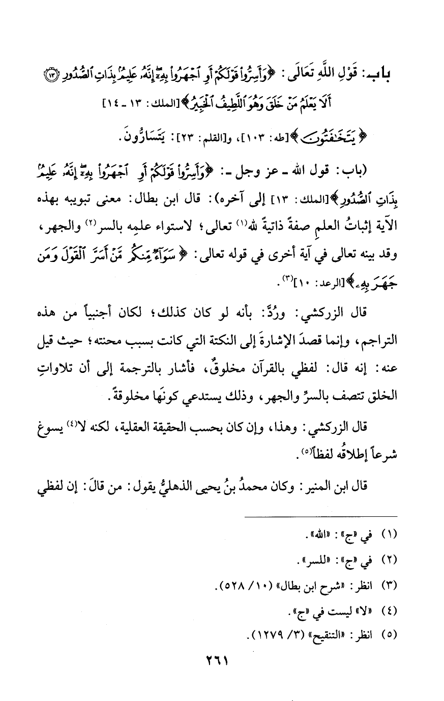 (باب: قول الله - عز وجل -: {وَأَسِرُّوا قَوْلَكُمْ أَوِ اجْهَرُوا بِهِ إِنَّهُ عَلِيمٌ بِذَاتِ الصُّدُورِ} [الملك: 13] إلى آخره): قال ابن بطال: معنى تبويبه بهذه الآية إثباتُ العلمِ صفةً ذاتيةً لله (¬1) تعالى؛ لاستواء علمِه بالسر (¬2) والجهر، وقد بينه تعالى في آية أخرى في قوله تعالى: {سَوَاءٌ مِنْكُمْ مَنْ أَسَرَّ الْقَوْلَ وَمَنْ جَهَرَ بِهِ} [الرعد: 10] (¬3).