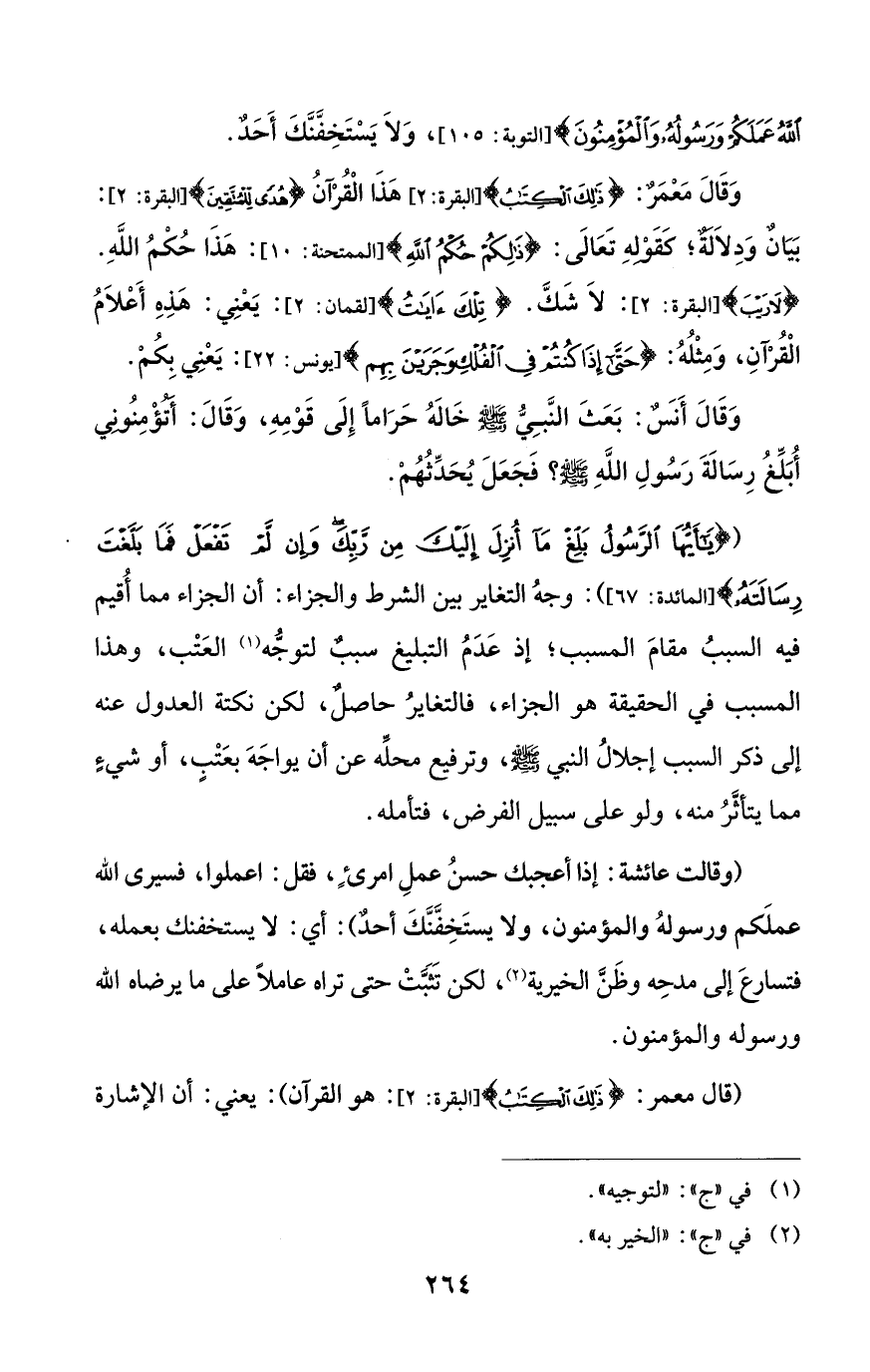 وَقَالَ مَعْمَر: {ذَلِكَ الْكِتَابُ} [البقرة: 2] هَذَا الْقُرْآنُ {هُدًى لِلْمُتَّقِينَ} [البقرة: 2]: بَيَانٌ وَدِلاَلَةٌ؛ كَقَوْلِهِ تَعَالَى: {ذَلِكُمْ حُكْمُ اللَّهِ} [الممتحنة: 10]: هَذَا حُكْمُ اللَّهِ. {لَا رَيْبَ} [البقرة: 2]: لاَ شَكَّ. {تِلْكَ آيَاتُ} [لقمان: 2]: يَعْنِي: هَذِهِ أَعْلاَمُ الْقُرْآنِ، وَمِثْلُهُ: {حَتَّى إِذَا كُنْتُمْ فِي الْفُلْكِ وَجَرَيْنَ بِهِمْ} [يونس: 22]: يَعْنِي بِكُمْ.