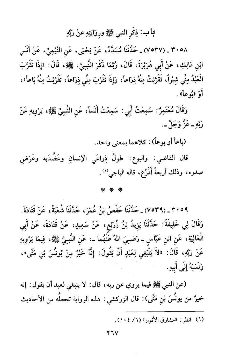 3059 - (7539) - حَدَّثَنَا حَفْصُ بْنُ عُمَرَ، حَدَّثَنَا شُعْبَةُ، عَنْ قَتَادَةَ. وَقَالَ لِي خَلِيفَةُ: حَدَّثَنَا يَزِيدُ بْنُ زُرَيْعٍ، عَنْ سَعِيدٍ، عَنْ قَتَادَةَ، عَنْ أَبِي الْعَالِيَةِ، عَنِ ابْنِ عَبَّاسٍ - رَضِيَ اللهُ عَنْهُما -، عَنِ النَّبِيِّ - صلى الله عليه وسلم -، فِيمَا يَرْوِيهِ عَنْ رَبِّهِ، قَالَ: "لاَ يَنْبَغِي لِعَبْدٍ أَنْ يَقُولَ: إِنَّهُ خَيْرٌ مِنْ يُونُسَ بْنِ مَتَّى"، وَنسَبَهُ إِلَى أَبِيهِ.