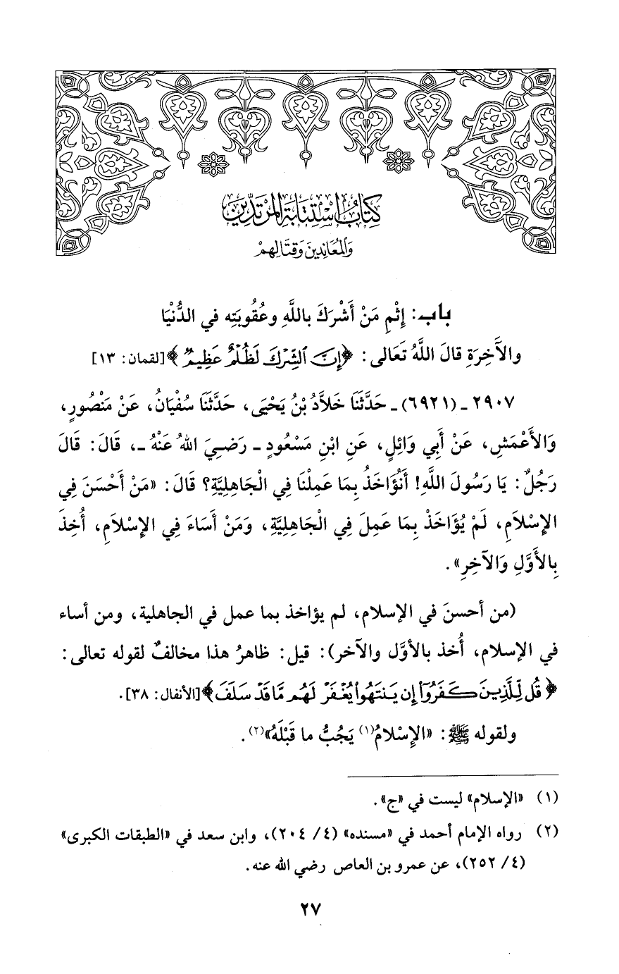 2907 - (6921) - حَدَّثَنَا خَلاَّدُ بْنُ يَحْيَى، حَدَّثَنَا سُفْيَانُ، عَنْ مَنْصُورٍ، وَالأَعْمَشِ، عَنْ أَبِي وَائِلٍ، عَنِ ابْنِ مَسْعُودٍ - رَضِيَ اللهُ عَنْهُ -، قَالَ: قَالَ رَجُلٌ: يَا رَسُولَ اللهِ! أَنَؤَاخَذُ بِمَا عَمِلْنَا فِي الْجَاهِلِيَّةِ؟ قَالَ: "مَنْ أَحْسَنَ فِي الإِسْلَامِ، لَمْ يُؤَاخَذْ بِمَا عَمِلَ فِي الْجَاهِلِيَّةِ، وَمَنْ أَسَاءَ فِي الإسْلَامِ، أُخِذَ بِالأَوَلِ وَالآخِرِ".