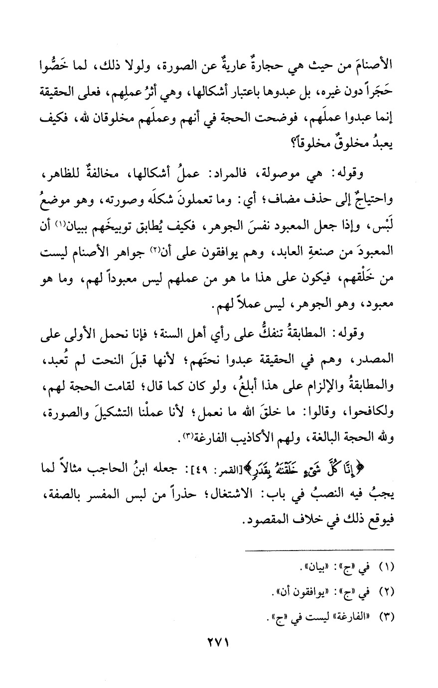 وقوله: المطابقةُ تنفكُّ على رأي أهل السنة؛ فإنا نحمل الأولى على المصدر، وهم في الحقيقة عبدوا نحتَهم؛ لأنها قبلَ النحت لم تُعبد، والمطابقةُ والإلزام على هذا أبلغُ، ولو كان كما قال؛ لقامت الحجة لهم، ولكافحوا، وقالوا: ما خلقَ الله ما نعمل؛ لأنا عملْنا التشكيلَ والصورة، ولله الحجة البالغة، ولهم الأكاذيب الفارغة (¬3).
