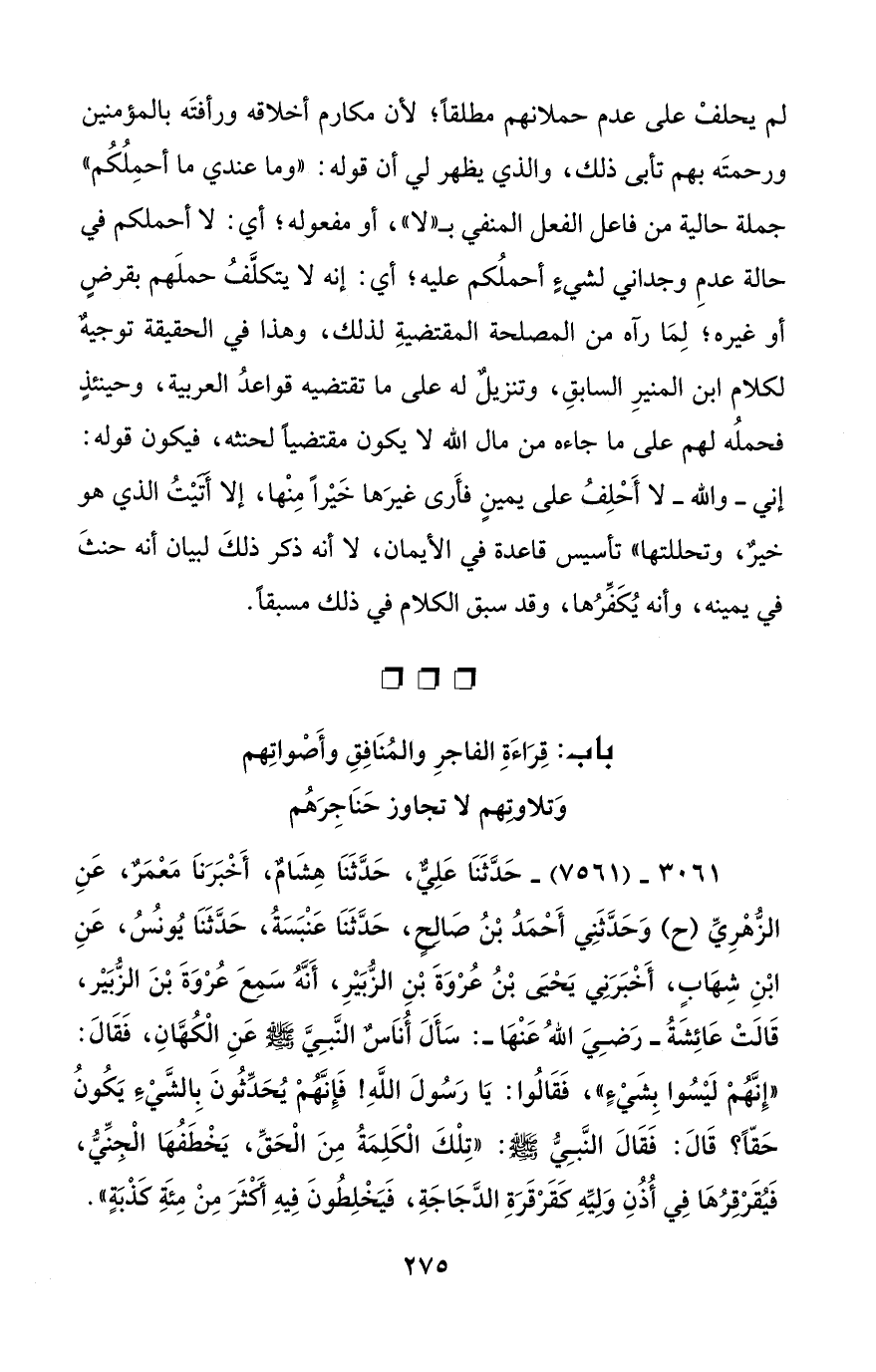 لم يحلفْ على عدم حملانهم مطلقاً؛ لأن مكارم أخلاقه ورأفتَه بالمؤمنين ورحمتَه بهم تأبى ذلك، والذي يظهر لي أن قوله: "وما عندي ما أحمِلُكُم" جملة حالية من فاعل الفعل المنفي بـ "لا"، أو مفعوله؛ أي: لا أحملكم في حالة عدمِ وجداني لشيءٍ أحملُكم عليه؛ أي: إنه لا يتكلَّفُ حملَهم بقرضٍ أو غيره؛ لِمَا رآه من المصلحة المقتضيةِ لذلك، وهذا في الحقيقة توجيهٌ لكلام ابن المنيرِ السابقِ، وتنزيلٌ له على ما تقتضيه قواعدُ العربية، وحينئذٍ فحملُه لهم على ما جاءه من مال الله لا يكون مقتضياً لحنثه، فيكون قوله: إني - والله - لا أَحْلِفُ على يمينٍ فأَرى غيرَها خَيْراً مِنْها، إلا أَتَيْتُ الذي هو خيرٌ، وتحللتها" تأسيس قاعدة في الأيمان، لا أنه ذكر ذلكَ لبيان أنه حنثَ في يمينه، وأنه يُكَفِّرُها، وقد سبق الكلام في ذلك مسبقاً.