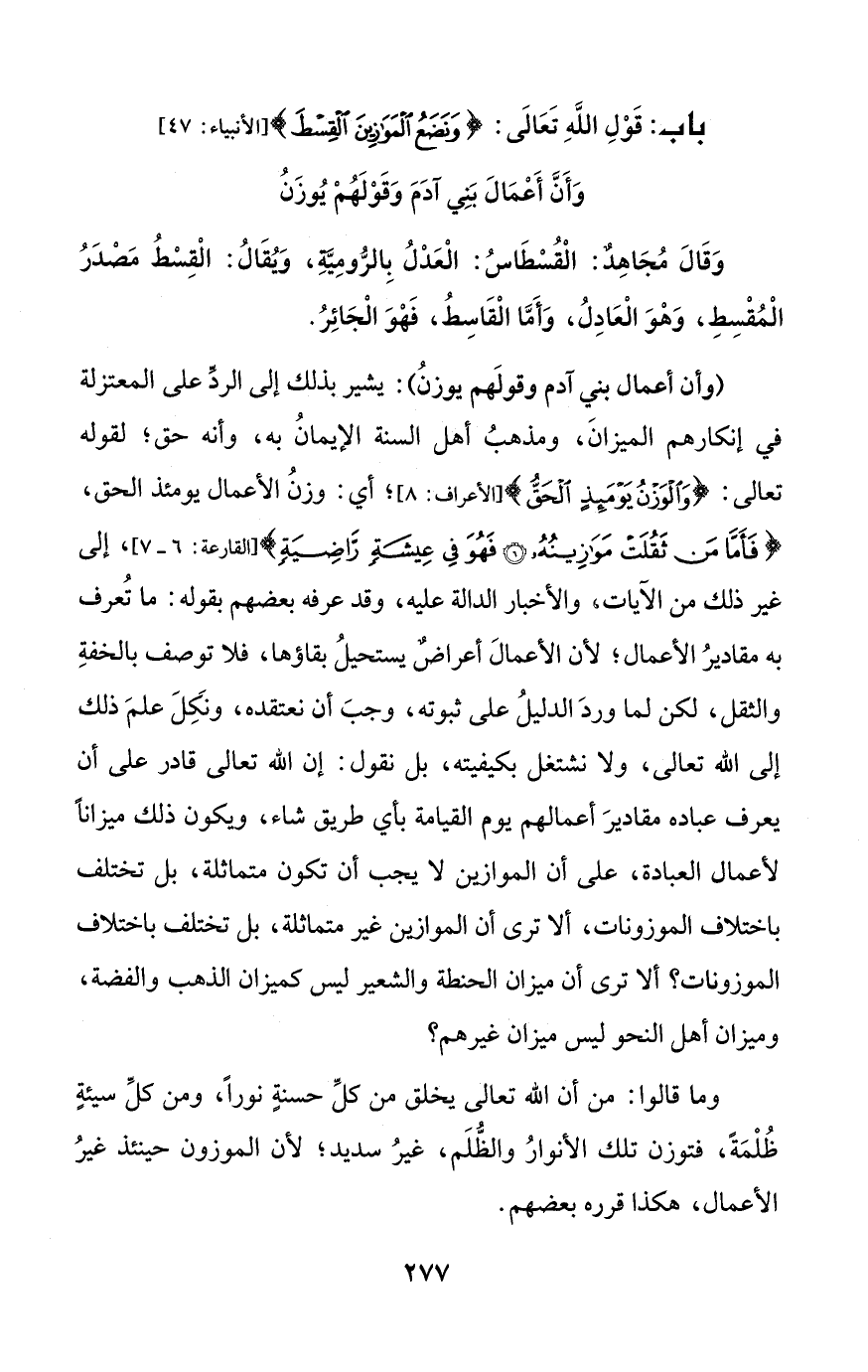 باب: قَوْلِ اللَّهِ تَعَالَى: {وَنَضَعُ الْمَوَازِينَ الْقِسْطَ} [الأنبياء: 47] وَأَنَّ أَعْمَالَ بَنِي آدَمَ وَقَوْلَهُمْ يُوزَنُ