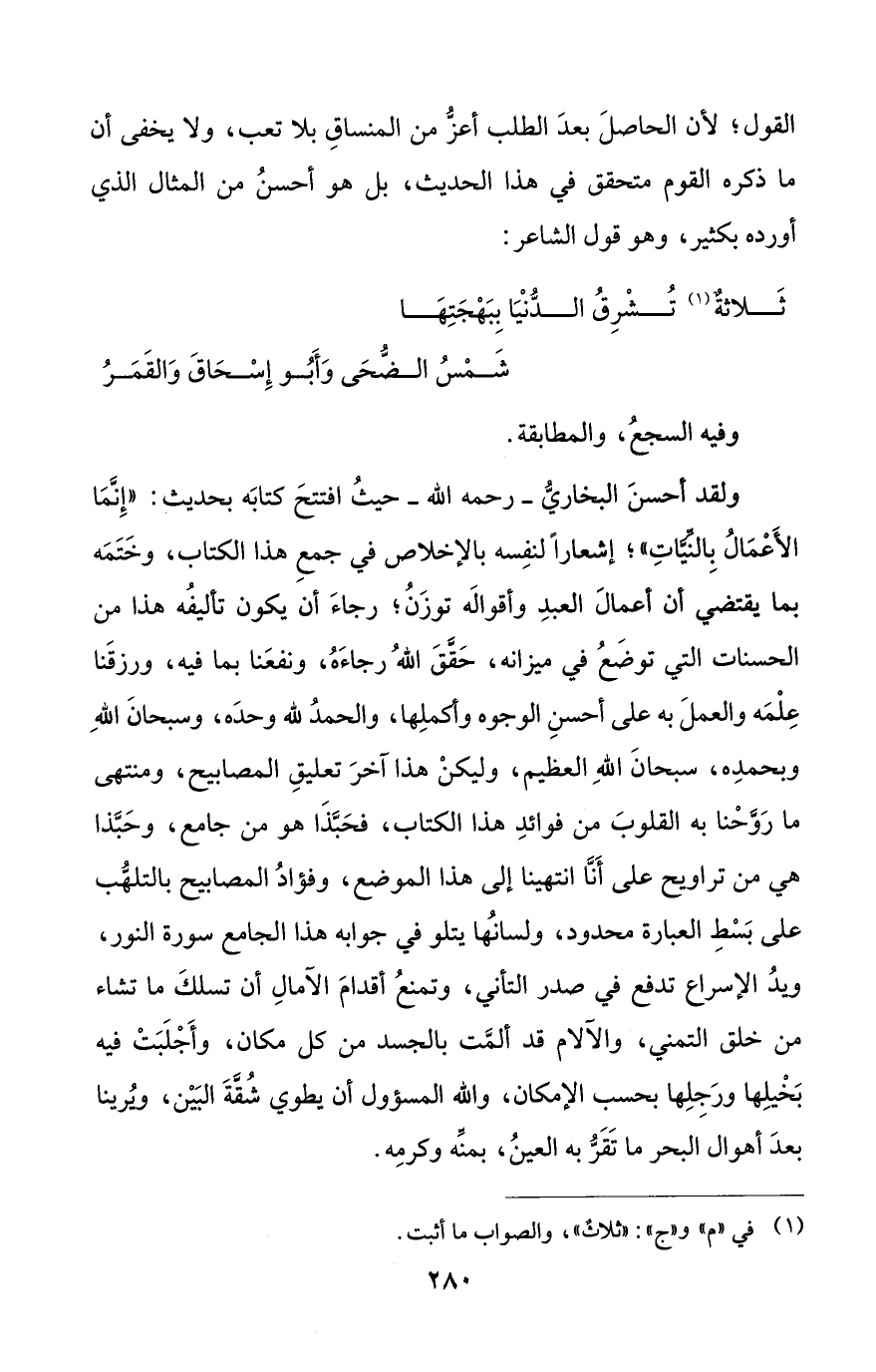ولقد أحسنَ البخاريُّ - رحمه الله - حيثُ افتتحَ كتابَه بحديث: "إِنَّمَا الأَعْمَالُ بِالنِّيَّاتِ"؛ إشعاراً لنفِسه بالإخلاص في جمعِ هذا الكتاب، وخَتَمَه بما يقتضي أن أعمالَ العبدِ وأقوالَه توزَنُ؛ رجاءَ أن يكون تأليفُه هذا من الحسنات التي توضَعُ في ميزانه، حَقَّقَ اللهُ رجاءَهُ، ونفعَنا بما فيه، ورزقَنا عِلْمَه والعملَ به على أحسنِ الوجوه وأكملِها، والحمدُ لله وحدَه، وسبحانَ اللهِ وبحمدِه، سبحانَ اللهِ العظيم، وليكنْ هذا آخرَ تعليقِ المصابيح، ومنتهى ما رَوَّحْنا به القلوبَ من فوائدِ هذا الكتاب، فحَبَّذَا هو من جامع، وحَبَّذا هي من تراويح على أَنَّا انتهينا إلى هذا الموضع، وفؤادُ المصابيح بالتلهُّب على بَسْطِ العبارة محدود، ولسانُها يتلو في جوابه هذا الجامع سورة النور، ويدُ الإسراع تدفع في صدر التأني، وتمنعُ أقدامَ الآمالِ أن تسلكَ ما تشاء من خلق التمني، والآلام قد ألمَّت بالجسد من كل مكان، وأَجْلَبَتْ فيه بَخْيلِها ورَجِلِها بحسب الإمكان، والله المسؤول أن يطوي شُقَّةَ البَيْن، ويُرينا بعدَ أهوال البحر ما تَقَرُّ به العينُ، بمنِّه وكرمِه.