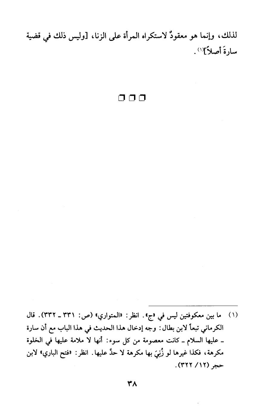 (¬1) ما بين معكوفتين ليس في "ج". انظر: "المتواري" (ص: 331 - 332). قال الكرماني تبعاً لابن بطال: وجه إدخال هذا الحديث في هذا الباب مع أن سارة - عليها السلام - كانت معصومة من كل سوء: أنها لا ملامة عليها في الخلوة مكرهة، فكذا غيرها لو زُنِيَ بها مكرهة لا حدَّ عليها. انظر: "فتح الباري" لابن حجر (12/ 322).