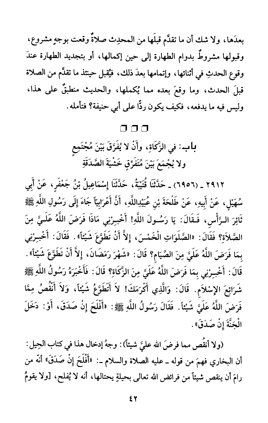 2912 - (6956) - حَدَّثَنَا قُتَيْبَةُ، حَدَّثَنَا إِسْمَاعِيلُ بْنُ جَعْفَرٍ، عَنْ أَبِي سُهَيْلٍ، عَنْ أَبيهِ، عَنْ طَلْحَةَ بْنِ عُبَيْدِ اللَّهِ، أَنَّ أَعْرَابِيّاً جَاءَ إِلَى رَسُولِ اللَّهِ - صلى الله عليه وسلم - ثَائِرَ الرَّأْسِ، فَقَالَ: يَا رَسُولَ اللَّهِ! أَخْبِرْنِي مَاذَا فَرَضَ اللَّهُ عَلَيَّ مِنَ الصَّلاَةِ؟ فَقَالَ: "الصَّلَوَاتِ الْخَمْسَ، إِلَّا أَنْ تَطَوَّعَ شَيْئًا". فَقَالَ: أَخْبِرْنِي بِمَا فَرَضَ اللَّهُ عَلَيَّ مِنَ الصِّيَامِ؟ قَالَ: "شهْرَ رَمَضَانَ، إِلَّا أَنْ تَطَوَّعَ شَيْئاً". قَالَ: أَخْبِرْنِي بِمَا فَرَضَ اللَّهُ عَلَيَّ مِنَ الزَّكَاةِ؟ قَالَ: فَأَخْبَرَهُ رَسُولُ اللَّهِ - صلى الله عليه وسلم - شَرَائِعَ الإِسْلاَمِ. قَالَ: وَالَّذِي أَكْرَمَكَ! لاَ أَتَطَوَّعُ شَيْئاً، وَلاَ أَنْقُصُ مِمَّا فَرَضَ اللَّهُ عَلَيَّ شَيْئاً. فَقَالَ رَسُولُ اللَّهِ - صلى الله عليه وسلم -: "أَفْلَحَ إِنْ صَدَقَ، أَوْ: دَخَلَ الْجَنَّةَ إِنْ صَدَقَ".