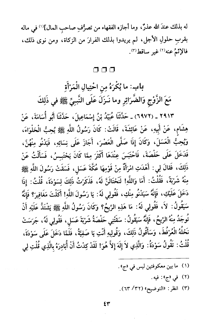 2913 - (6972) - حَدَّثَنَا عُبَيْدُ بْنُ إِسْمَاعِيلَ، حَدَّثَنَا أبو أُسَامَةَ، عَنْ هِشَامٍ، عَنْ أَبيهِ، عَنْ عَائِشَةَ، قَالَتْ: كَانَ رَسُولُ اللَّهِ - صلى الله عليه وسلم - يُحِبُّ الْحَلْوَاءَ، وَيُحِبُّ الْعَسَلَ، وَكَانَ إِذَا صَلَّى الْعَصْرَ، أَجَازَ عَلَى نِسَائِهِ، فَيَدْنُو مِنْهُنَّ، فَدَخَلَ عَلَى حَفْصَةَ، فَاحْتبَسَ عِنْدَهَا أَكْثَرَ مِمَّا كَانَ يَحْتَبِسُ، فَسَألْتُ عَنْ ذَلِكَ، فَقالَ لِي: أَهْدَتِ امْرَأَةٌ مِنْ قَوْمِهَا عُكَّةَ عَسَلٍ، فَسَقَتْ رَسُولَ اللَّهِ - صلى الله عليه وسلم - مِنْهُ شَرْبَةً، فَقُلْتُ: أَمَا وَاللَّهِ! لَنَحْتَالَنَّ لَهُ، فَذَكَرْتُ ذَلِكَ لِسَوْدَةَ، قُلْتُ: إِذَا دَخَلَ عَلَيْكِ، فَإِنَّهُ سَيَدْنوُ مِنْكِ، فَقُولي لَهُ: يَا رَسُولَ اللَّهِ! أكَلْتَ مَغَافِيرَ؟ فَإِنَّه سَيقُولُ: لاَ، فَقُولي لَهُ: مَا هَذه الرِّيحُ؟ وَكَانَ رَسُولُ اللَّهِ - صلى الله عليه وسلم - يَشْتَدُّ عَلَيهِ أَنْ تُوجَدُ مِنْهُ الرِّيحُ، فَإِنَّهُ سَيقُولُ: سَقَتْنِي حَفْصَةُ شَرْبَةَ عَسَلٍ، فَقُولِي لَهُ، جَرَسَتْ نَحْلُهُ الْعُرْفُطَ، وَسَأقولُ ذَلِكَ، وَقُوليهِ أَنْتِ يَا صَفِيَّةُ، فَلَمَّا دَخَلَ عَلَى سَوْدَةَ، قُلْتُ: تَقُولُ سَوْدةٌ: وَالَّذِي لاَ إِلَهَ إِلَّا هُوَ! لَقَدْ كِدْتُ أَنْ أُبَادِرَهُ بِالَّذِي قُلْتِ لِي