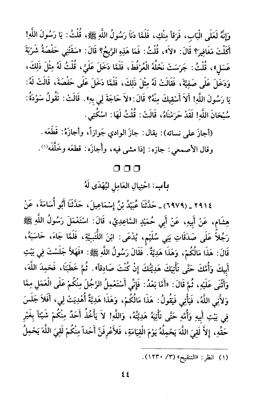 2914 - (6979) - حَدَّثَنَا عُبَيْدُ بْنُ إِسْمَاعِيلَ، حَدَّثَنَا أَبُو أُسَامَةَ، عَنْ هِشَامٍ، عَنْ أَبيهِ، عَنْ أَبِي حُمَيْدٍ السَّاعِدِيِّ، قَالَ: اسْتَعْمَلَ رَسُولُ اللَّهِ - صلى الله عليه وسلم - رَجُلًا عَلَى صَدَقَاتِ بَنِي سُلَيْمٍ، يُدْعَى: ابْنَ اللُّتَبِيَّةِ، فَلَمَّا جَاءَ، حَاسَبَهُ، قَالَ: هَذَا مَالُكُمْ، وَهَذَا هَدِيَّةٌ. فَقَالَ رَسُولُ اللَّهِ - صلى الله عليه وسلم -: "فَهَلَّا جَلَسْتَ في بَيْتِ أَبيكَ وَأُمِّكَ حَتَّى تَأْتِيَكَ هَدِيَّتُكَ إِنْ كُنْتَ صَادِقًا". ثُمَّ خَطَبَنَا، فَحَمِدَ اللَّهَ، وَأثنَى عَلَيْهِ، ثُمَّ قَالَ: "أَمَّا بَعْدُ: فَإِنِّي أَسْتَعْمِلُ الرَّجُلَ مِنْكُمْ عَلَى الْعَمَلِ مِمَّا وَلَّانِي اللَّهُ، فَيَأْتِي فَيَقُولُ: هَذَا مَالُكُمْ، وَهَذَا هَدِيَّةٌ أُهْدِيَتْ لِي، أفلاَ جَلَسَ في بَيْتِ أَبِيهِ وَأُمِّهِ حَتَّى تأْتِيَهُ هَدِيَّتُهُ، وَاللَّهِ! لاَ يَأْخُذُ أَحَدٌ مِنْكُمْ شَيْئًا بِغَيْرِ حَقِّهِ، إِلَّا لَقِيَ اللَّهَ يَحْمِلُهُ يَوْمَ الْقِيَامَةِ، فَلأَعْرِفَنَّ أَحَدًا مِنْكُمْ لَقِيَ اللَّهَ يَحْمِلُ