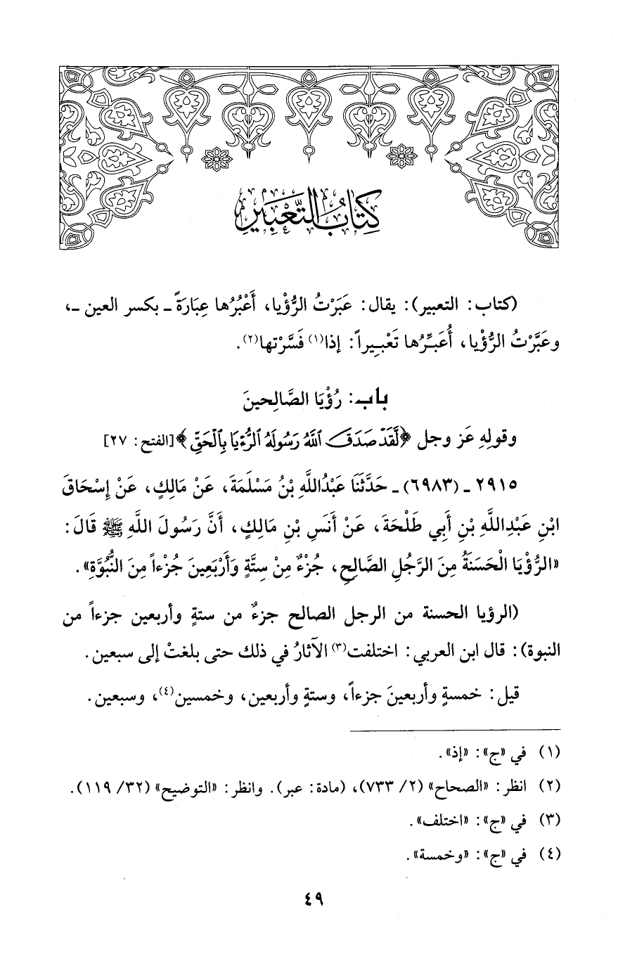 (كتاب: التعبير): يقال: عَبَرْتُ الرُّؤْيا، أَعْبُرُها عِبَارةً - بكسر العين -، وعَبَّرْتُ الرُّؤْيا، أُعَبِّرُها تَعْبِيراً: إذا (¬1) فَسَّرْتها (¬2).