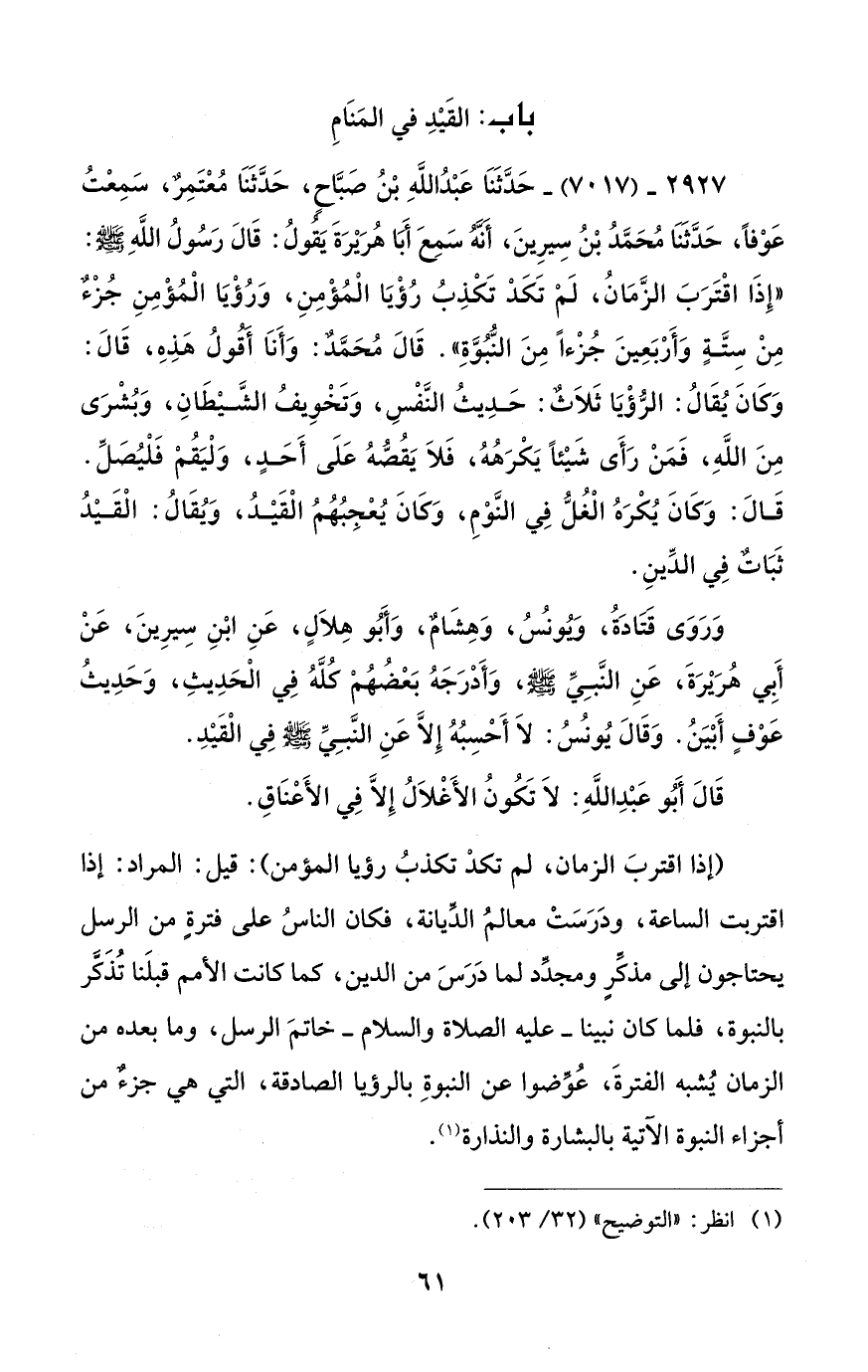 2927 - (7017) - حَدَّثَنَا عَبْدُ اللَّهِ بْنُ صَبَّاحٍ، حَدَّثَنَا مُعْتَمِرٌ، سَمِعْتُ عَوْفاً، حَدَّثَنَا مُحَمَّدُ بْنُ سِيرِينَ، أنَّهُ سَمِعَ أَبَا هُرَيْرَةَ يَقولُ: قَالَ رَسُولُ اللَّهِ - صلى الله عليه وسلم -: "إِذَا اقْتَرَبَ الزَّمَانُ، لَمْ تَكَدْ تَكْذِبُ رُؤْيَا الْمُؤْمِنِ، وَرُؤْيَا الْمُؤْمِنِ جُزْءٌ مِنْ سِتَّةٍ وَأَرْبَعِينَ جُزْءاً مِنَ النُّبُوَّةِ". قَالَ مُحَمَّدٌ: وَأَنَا أقولُ هَذِهِ، قَالَ: وَكَانَ يُقَالُ: الرُّؤْيَا ثَلاَثٌ: حَدِيثُ النَّفْسِ، وَتَخْوِيفُ الشَّيْطَانِ، وَبُشْرَى مِنَ اللَّهِ، فَمَنْ رَأَى شَيْئاً يَكْرَهُهُ، فَلاَ يَقُصُّهُ عَلَى أَحَدٍ، وَلْيَقُمْ فَلْيُصَلِّ. قَالَ: وَكَانَ يُكْرَهُ الْغُلُّ في النَّوْمِ، وَكَانَ يُعْجِبُهُمُ الْقَيْدُ، وَيُقَالُ: الْقَيْدُ ثَبَاتٌ في الدِّينِ.