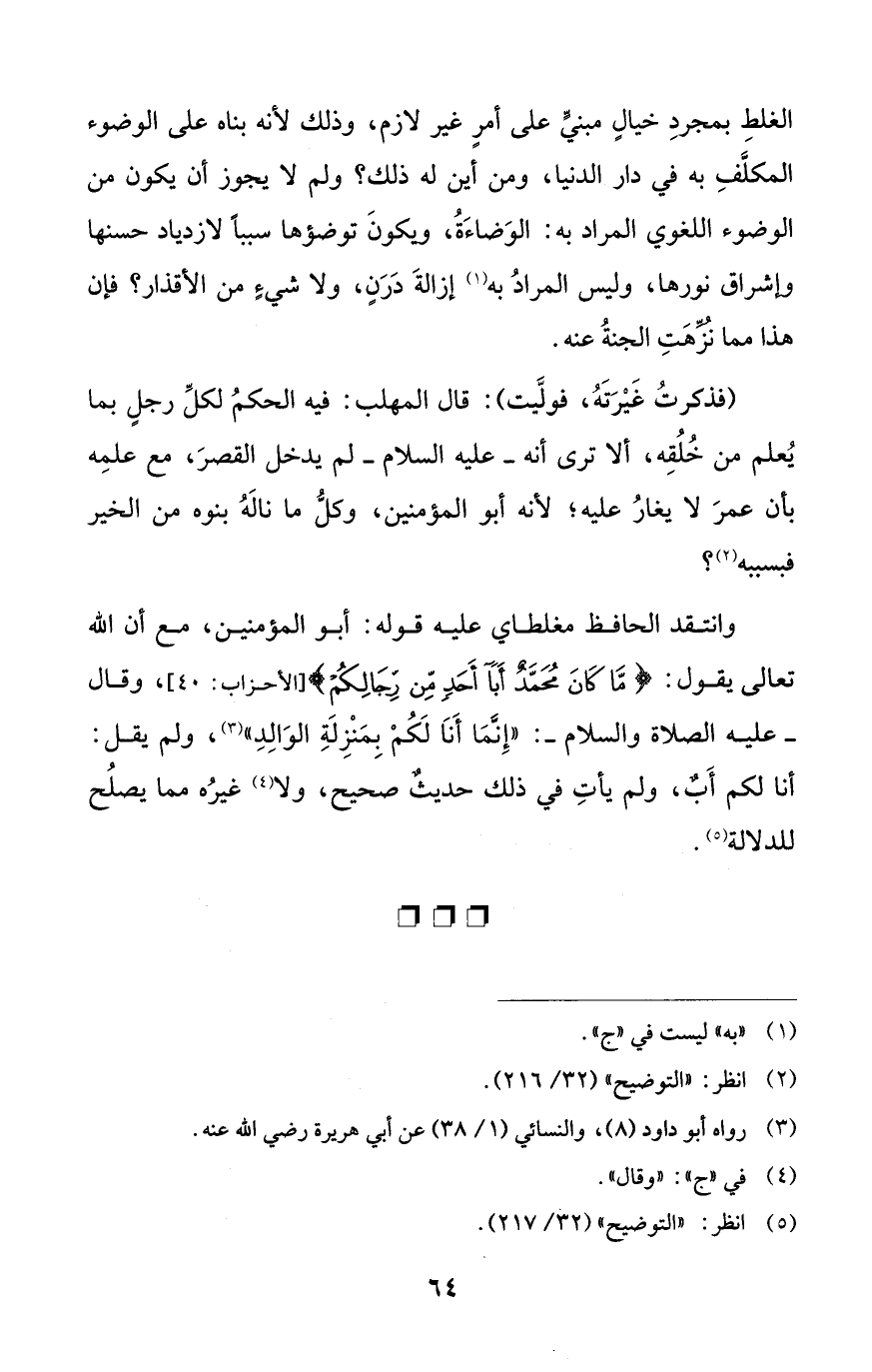 وانتقد الحافظ مغلطاي عليه قوله: أبو المؤمنين، مع أن الله تعالى يقول: {مَا كَانَ مُحَمَّدٌ أَبَا أَحَدٍ مِنْ رِجَالِكُمْ} [الأحزاب: 40]، وقال - عليه الصلاة والسلام -: "إِنَّمَا أَناَ لَكُمْ بِمَنْزِلَةِ الوَالِدِ" (¬3)، ولم يقل: أنا لكم أَبٌ، ولم يأتِ في ذلك حديثٌ صحيح، ولا (¬4) غيرُه مما يصلُح للدلالة (¬5).