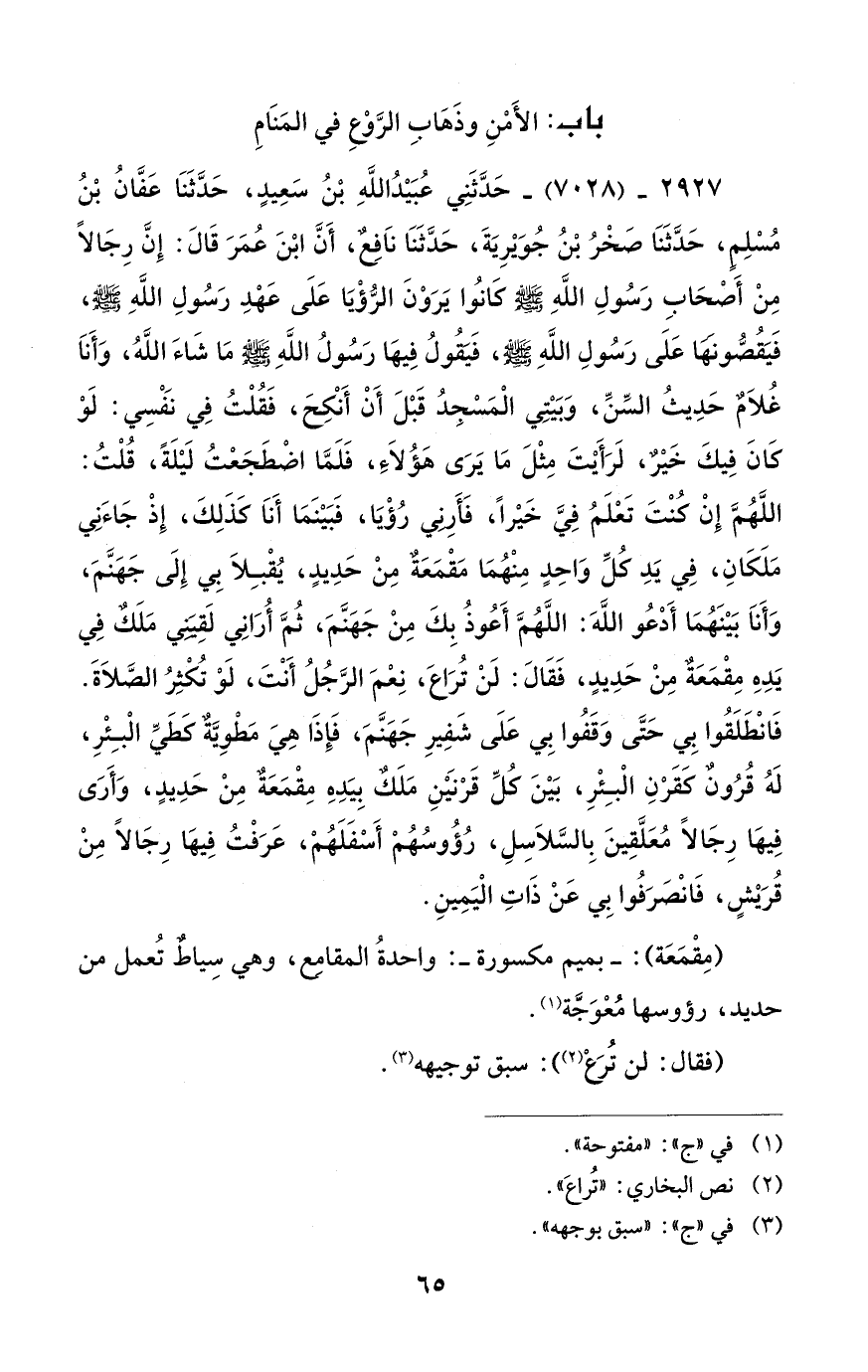 2927 - (7028) - حَدَّثَنِي عُبَيْدُ اللَّهِ بْنُ سَعِيدٍ، حَدَّثَنَا عَفَّانُ بْنُ مُسْلِمٍ، حَدَّثَنَا صَخْرُ بْنُ جُوَيْرِيَةَ، حَدَّثَنَا ناَفِعٌ، أَنَّ ابْنَ عُمَرَ قَالَ: إِنَّ رِجَالًا مِنْ أَصْحَابِ رَسُولِ اللَّهِ - صلى الله عليه وسلم - كَانُوا يَرَوْنَ الرُّؤْيَا عَلَى عَهْدِ رَسُولِ اللَّهِ - صلى الله عليه وسلم -، فَيَقُصُّونَهَا عَلَى رَسُولِ اللَّهِ - صلى الله عليه وسلم -، فَيقُولُ فِيهَا رَسُولُ اللَّهِ - صلى الله عليه وسلم - مَا شَاءَ اللَّهُ، وَأَنَا غُلاَمٌ حَدِيثُ السِّنِّ، وَبَيْتِي الْمَسْجِدُ قَبْلَ أَنْ أَنْكِحَ، فَقُلْتُ في نَفْسِي: لَوْ كَانَ فِيكَ خَيْرٌ، لَرَأَيْتَ مِثْلَ مَا يَرَى هَؤُلاَءِ، فَلَمَّا اضْطَجَعْتُ لَيْلَةً، قُلْتُ: اللَّهُمَّ إِنْ كُنْتَ تَعْلَمُ فِيَّ خَيْراً، فَأَرِنِي رُؤْيَا، فَبَيْنَمَا أَناَ كذَلِكَ، إِذْ جَاءَنِي مَلَكَانِ، في يَدِ كُلِّ وَاحِدٍ مِنْهُمَا مَقْمَعَةٌ مِنْ حَدِيدٍ، يُقْبِلاَ بِي إِلَى جَهَنَّمَ، وَأَنَا بَيْنَهُمَا أَدْعُو اللَّهَ: اللَّهُمَّ أَعُوذُ بِكَ مِنْ جَهَنَّمَ، ثُمَّ أُرَانِي لَقِيني مَلَكٌ فِي يَدِهِ مِقْمَعَةٌ مِنْ حَدِيدٍ، فَقَالَ: لَنْ تُرَاعَ، نِعْمَ الرَّجُلُ أَنْتَ، لَوْ تُكْثِرُ الصَّلاَةَ. فَانْطَلَقُوا بِي حَتَّى وَقَفُوا بِي عَلَى شَفِيرِ جَهَنَّمَ، فَإِذَا هِيَ مَطْوِيَّةٌ كَطَيِّ الْبِئْرِ، لَهُ قُرُونٌ كَقَرْنِ الْبِئْرِ، بَيْنَ كُلِّ قَرْنَيْنِ مَلَكٌ بِيَدِهِ مِقْمَعَةٌ مِنْ حَدِيدٍ، وَأَرَى فِيهَا رِجَالًا مُعَلَّقِينَ بِالسَّلاَسِلِ، رُؤُوسُهُمْ أَسْفَلَهُمْ، عَرَفْتُ فِيهَا رِجَالًا مِنْ قُرَيْشٍ، فَانْصَرَفُوا بِي عَنْ ذَاتِ الْيَمِينِ.