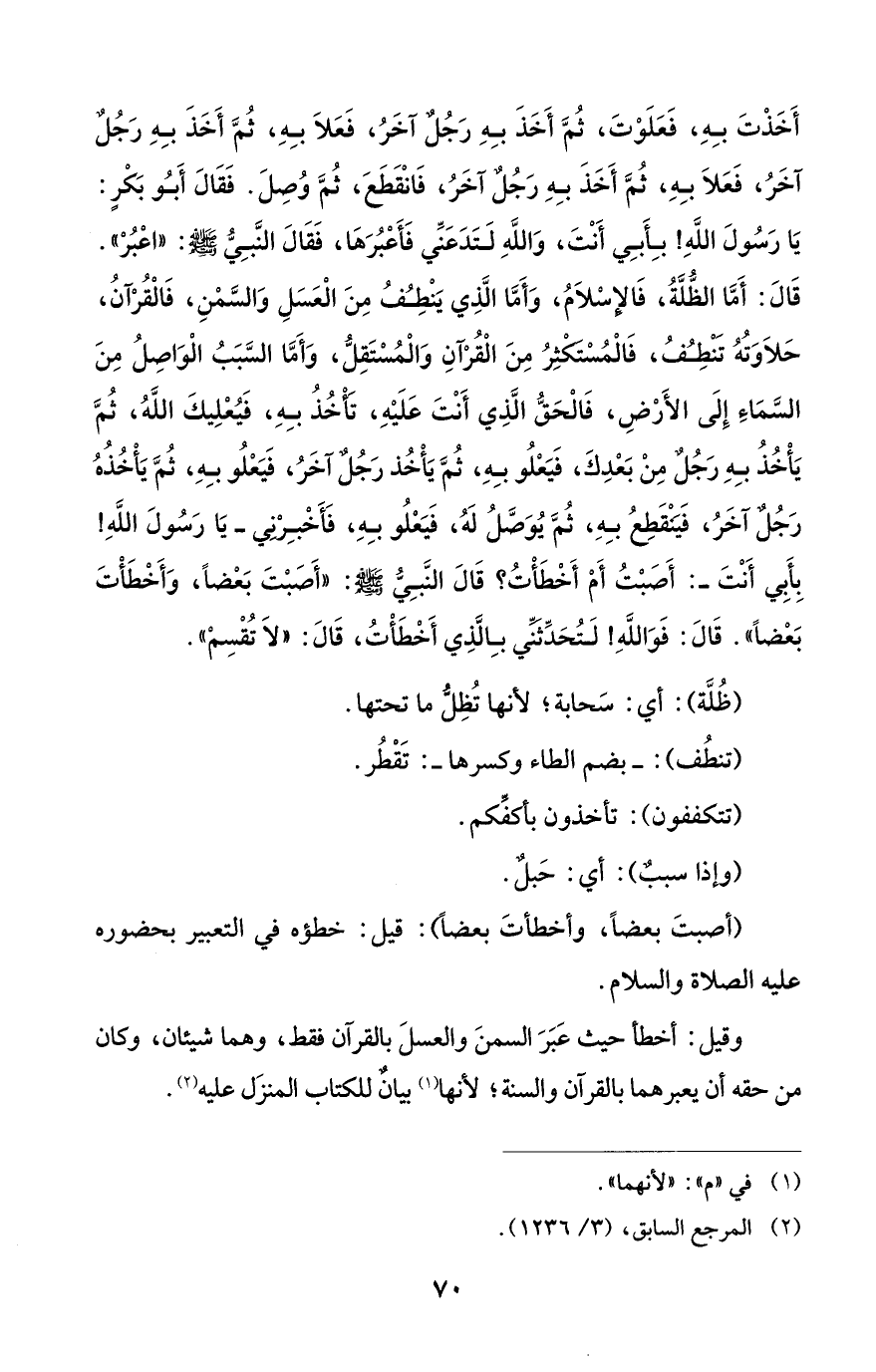 أَخَذْتَ بِهِ، فَعَلَوْتَ، ثُمَّ أَخَذَ بِهِ رَجُلٌ آخَرُ، فَعَلاَ بِهِ، ثُمَّ أَخَذَ بِهِ رَجُلٌ آخَرُ، فَعَلاَ بِهِ، ثُمَّ أَخَذَ بِهِ رَجُلٌ آخَرُ، فَانْقَطَعَ، ثُمَّ وُصِلَ. فَقَالَ أَبُو بَكْرٍ: يَا رَسُولَ اللَّهِ! بِأَبِي أَنْتَ، وَاللَّهِ لَتَدَعَنِّي فَأَعْبُرَهَا، فَقَالَ النَّبِيُّ - صلى الله عليه وسلم -: "اعْبُرْ". قَالَ: أَمَّا الظُّلَّةُ، فَالإِسْلاَمُ، وَأَمَّا الَّذِي يَنْطِفُ مِنَ الْعَسَلِ وَالسَّمْنِ، فَالْقُرْآنُ، حَلاَوَتُهُ تَنْطِفُ، فَالْمُسْتَكْثِرُ مِنَ الْقُرْآنِ وَالْمُسْتَقِلُّ، وَأَمَّا السَّبَبُ الْوَاصِلُ مِنَ السَّمَاءِ إِلَى الأَرْضِ، فَالْحَقُّ الَّذِي أَنْتَ عَلَيْهِ، تَأْخُذُ بِهِ، فَيُعْلِيكَ اللَّهُ، ثُمَّ يَأْخُذُ بِهِ رَجُلٌ مِنْ بَعْدِكَ، فَيَعْلُو بِهِ، ثُمَّ يَأْخُذ رَجُل آخَرُ، فَيَعْلُو بِهِ، ثُمَّ يَأْخُذُهُ رَجُلٌ آخَرُ، فَيَنْقَطِعُ بِهِ، ثُمَّ يُوَصَّلُ لَهُ، فَيَعْلُو بِهِ، فَأَخْبِرْنِي - يَا رَسُولَ اللَّهِ! بِأَبِي أَنْتَ -: أَصَبْتُ أَمْ أَخْطَأْتُ؟ قَالَ النَّبِيُّ - صلى الله عليه وسلم -: "أَصَبْتَ بَعْضاً، وَأَخْطَأْتَ بَعْضاً". قَالَ: فَوَاللَّهِ! لَتُحَدِّثَنِّي بِالَّذِي أَخْطَأْتُ، قَالَ: "لاَ تُقْسِمْ".