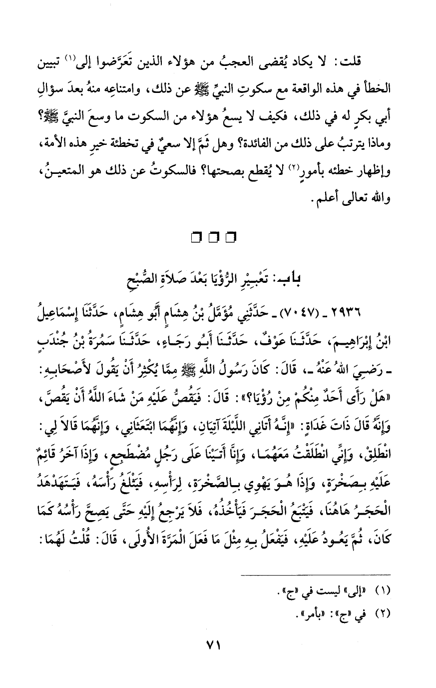 قلت: لا يكاد يُقضى العجبُ من هؤلاء الذين تَعَرَّضوا إلى (¬1) تبيين الخطأ في هذه الواقعة مع سكوتِ النبيَّ - صلى الله عليه وسلم - عن ذلك، وامتناعِه منهُ بعدَ سؤالِ أبي بكرٍ له في ذلك، فكيف لا يسعُ هؤلاء من السكوت ما وسعَ النبيَّ - صلى الله عليه وسلم -؟ وماذا يترتبُ على ذلك من الفائدة؟ وهل ثَمَّ إلا سعيٌ في تخطئة خيرِ هذه الأمة، وإظهار خطئه بأمورٍ (¬2) لا يُقطع بصحتها؟ فالسكوتُ عن ذلك هو المتعينُ، والله تعالى أعلم.