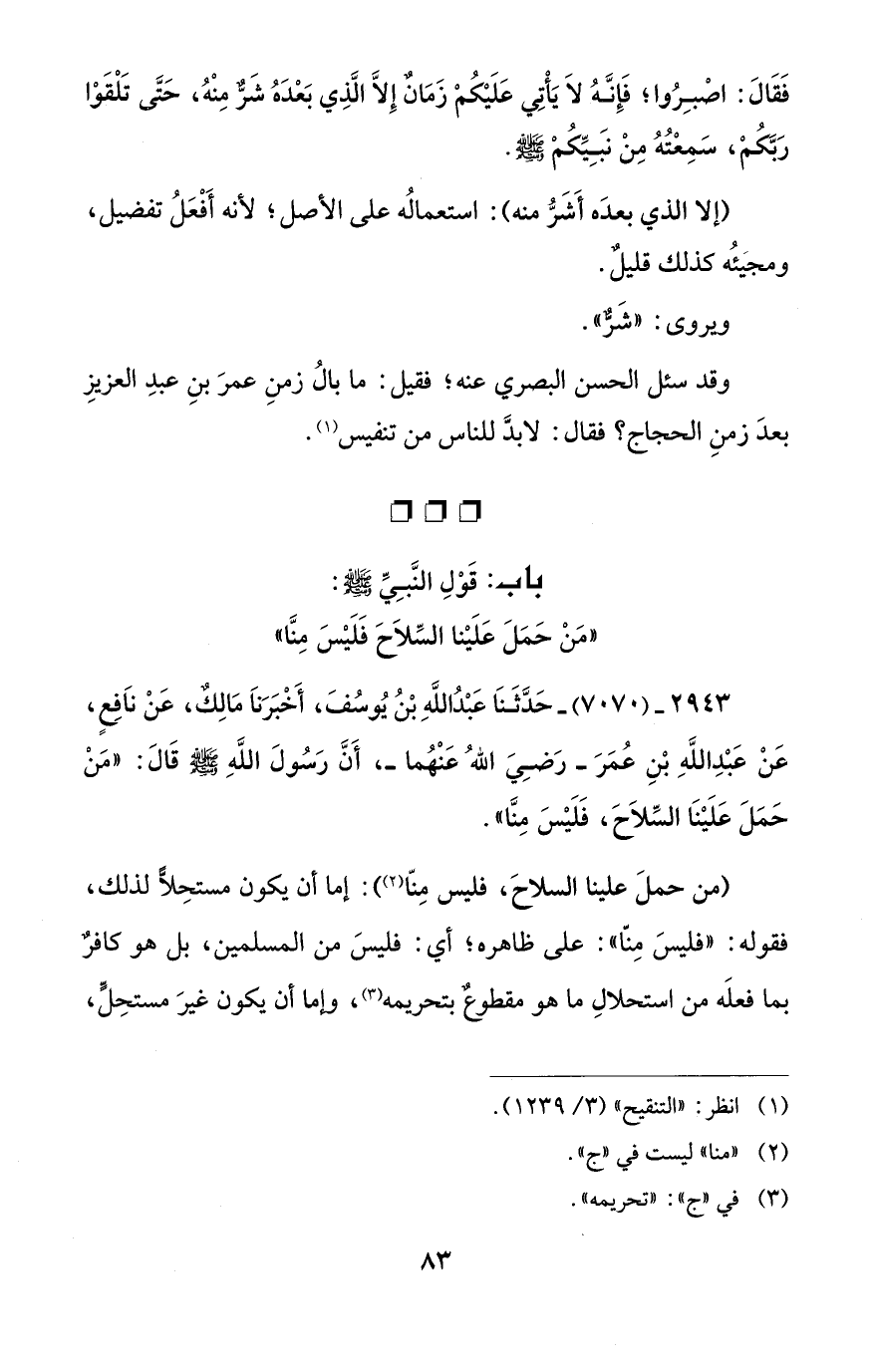 باب: قَوْلِ النَّبِيِّ - صلى الله عليه وسلم -: "مَنْ حَمَلَ عَلَيْنا السِّلاَحَ فَلَيْسَ مِنَّا"