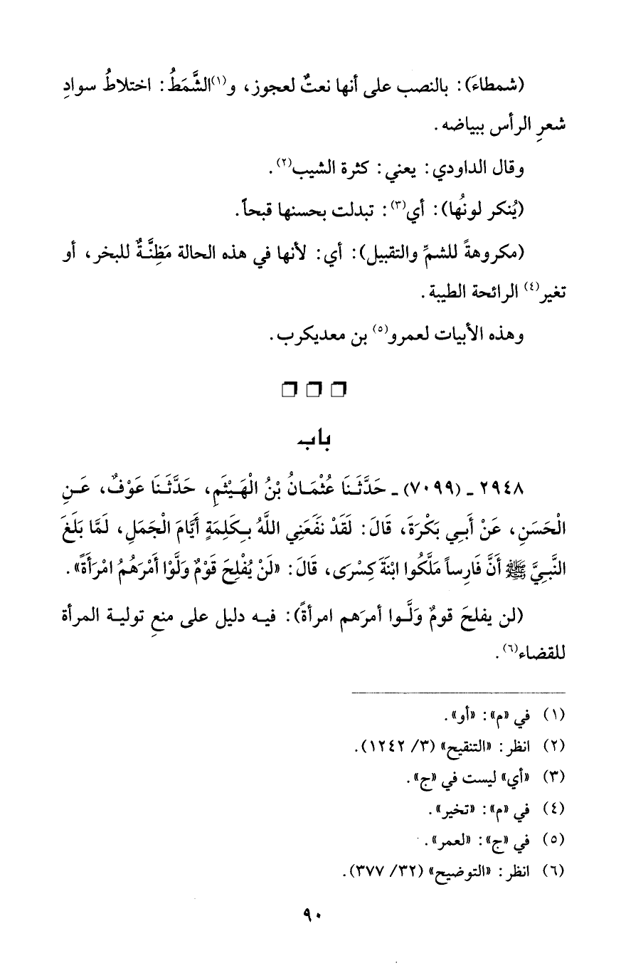 2948 - (7099) - حَدَّثَنَا عُثْمَانُ بْنُ الْهَيْثَمِ، حَدَّثَنَا عَوْفٌ، عَنِ الْحَسَنِ، عَنْ أَبِي بَكْرَةَ، قَالَ: لَقَدْ نَفَعَنِي اللَّهُ بِكَلِمَةٍ أيَّامَ الْجَمَلِ، لَمَّا بَلَغَ النَّبِيَّ - صلى الله عليه وسلم - أَنَّ فَارِساً مَلَّكُوا ابْنَةَ كِسْرَى، قَالَ: "لَنْ يُفْلِحَ قَوْمٌ وَلَّوْا أَمْرَهُمُ امْرَأَةً".