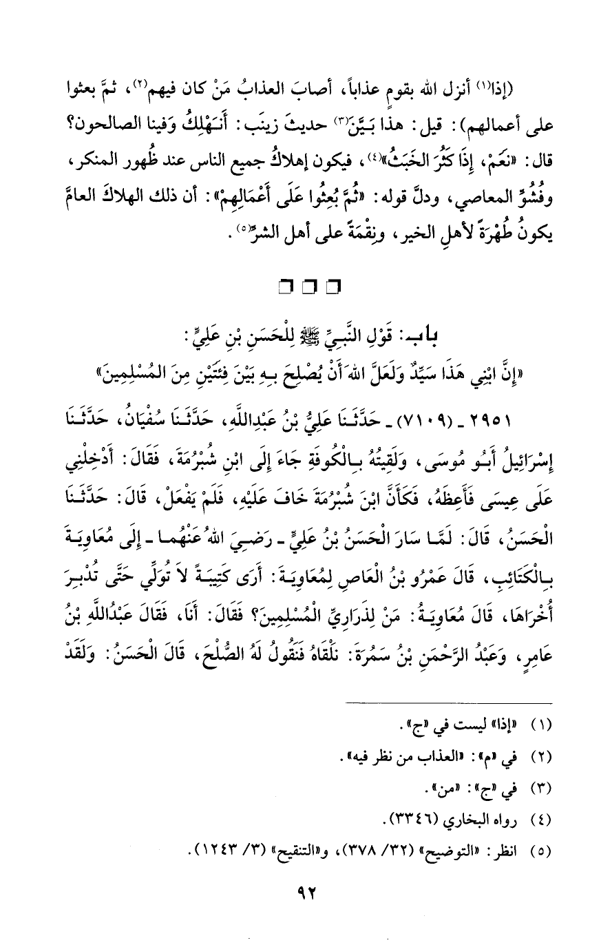 (إذا (¬1) أنزل الله بقومٍ عذاباً، أصابَ العذابُ مَنْ كان فيهم (¬2)، ثمَّ بعثوا على أعمالهم): قيل: هذا بَيَّنَ (¬3) حديثَ زينَب: أَنَهْلِكُ وَفينا الصالحون؟ قال: "نَعَمْ، إِذَا كَثُرَ الخَبَثُ" (¬4)، فيكون إهلاكُ جميع الناس عند ظُهور المنكر، وفُشُوِّ المعاصي، ودلَّ قوله: "ثُمَّ بُعِثُوا عَلَى أَعْمَالِهِمْ": أن ذلك الهلاكَ العامَّ يكونُ طُهْرَةً لأهلِ الخير، ونِقْمَةً على أهل الشرِّ (¬5).