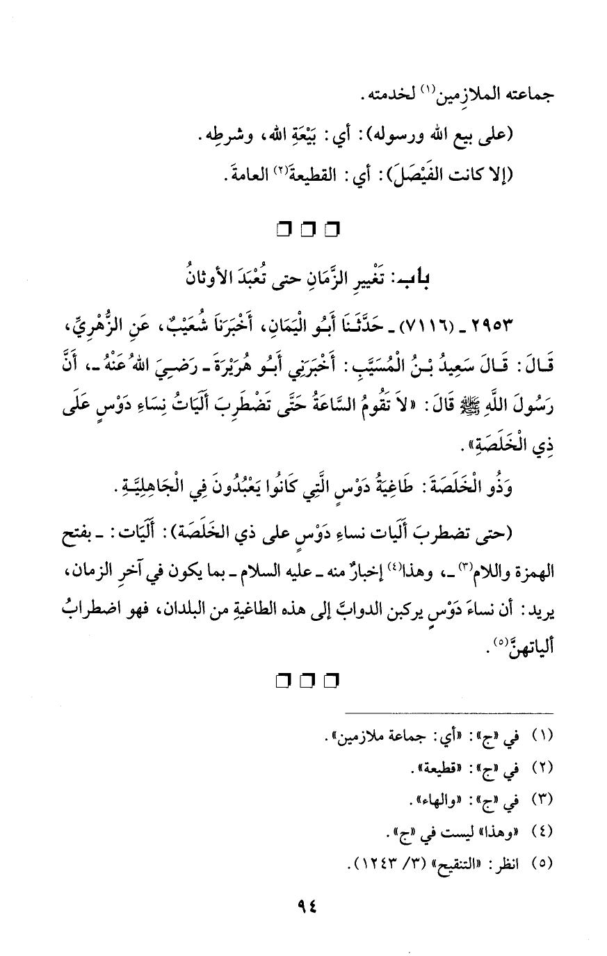 2953 - (7116) - حَدَّثَنَا أَبُو الْيَمَانِ، أَخْبَرَنَا شُعَيْبٌ، عَنِ الزُّهْرِيِّ، قَالَ: قَالَ سَعِيدُ بْنُ الْمُسَيَّبِ: أَخْبَرَنِي أَبُو هُرَيْرَةَ - رَضِيَ اللهُ عَنْهُ -، أَنَّ رَسُولَ اللَّهِ - صلى الله عليه وسلم - قَالَ: "لاَ تَقُومُ السَّاعَةُ حَتَّى تَضْطَرِبَ أَلَيَاتُ نِسَاءِ دَوْسٍ عَلَى ذِي الْخَلَصَةِ".