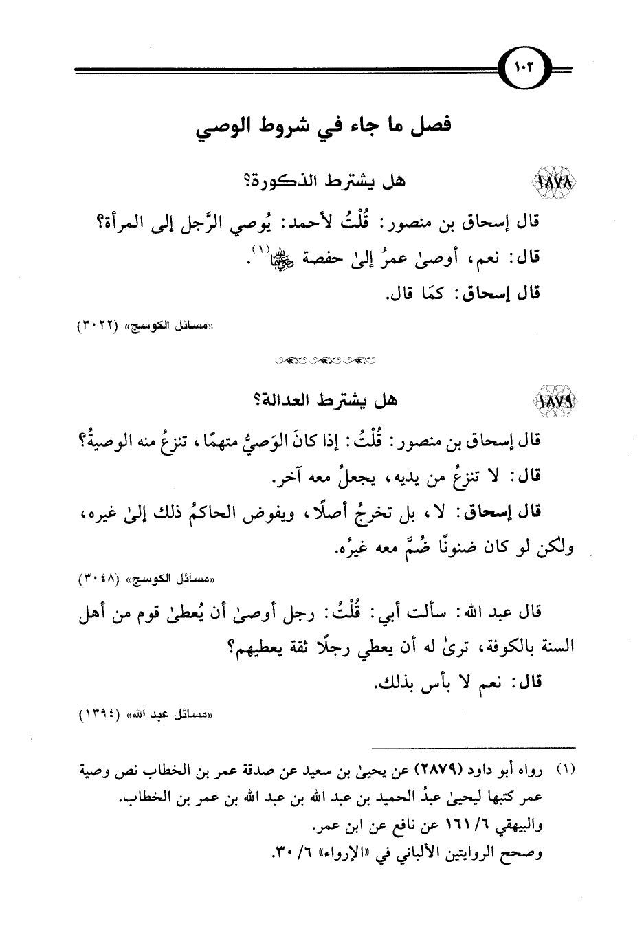 (¬1) رواه أبو داود (2879) عن يحيى بن سعيد عن صدقة عمر بن الخطاب نص وصية عمر كتبها ليحيى عبدُ الحميد بن عبد اللَّه بن عبد اللَّه بن عمر بن الخطاب.