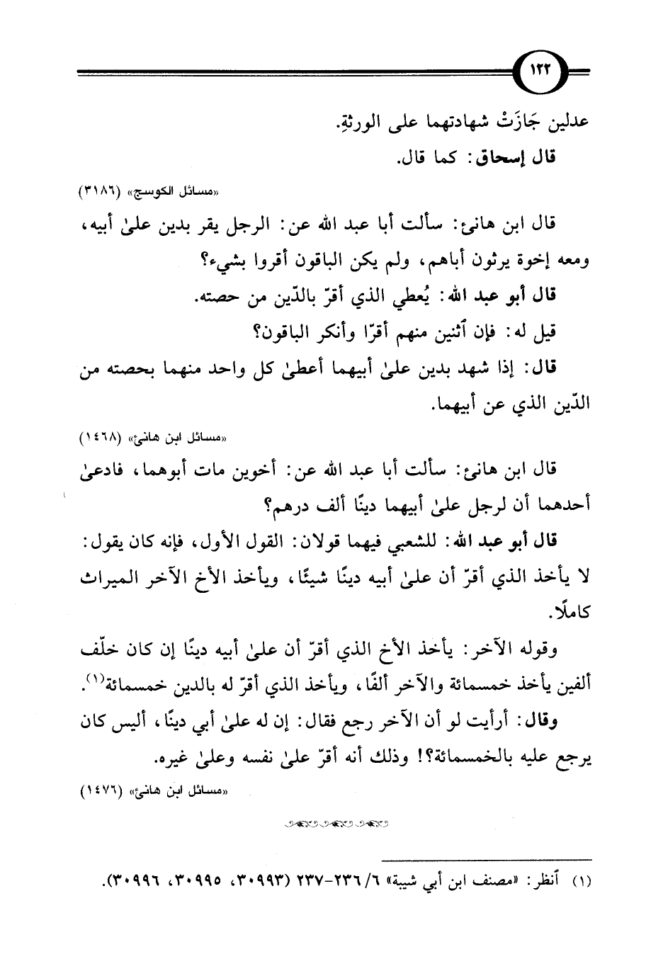قال ابن هانئ: سألت أبا عبد اللَّه عن: الرجل يقر بدين على أبيه، ومعه إخوة يرثون أباهم، ولم يكن الباقون أقروا بشيء؟
