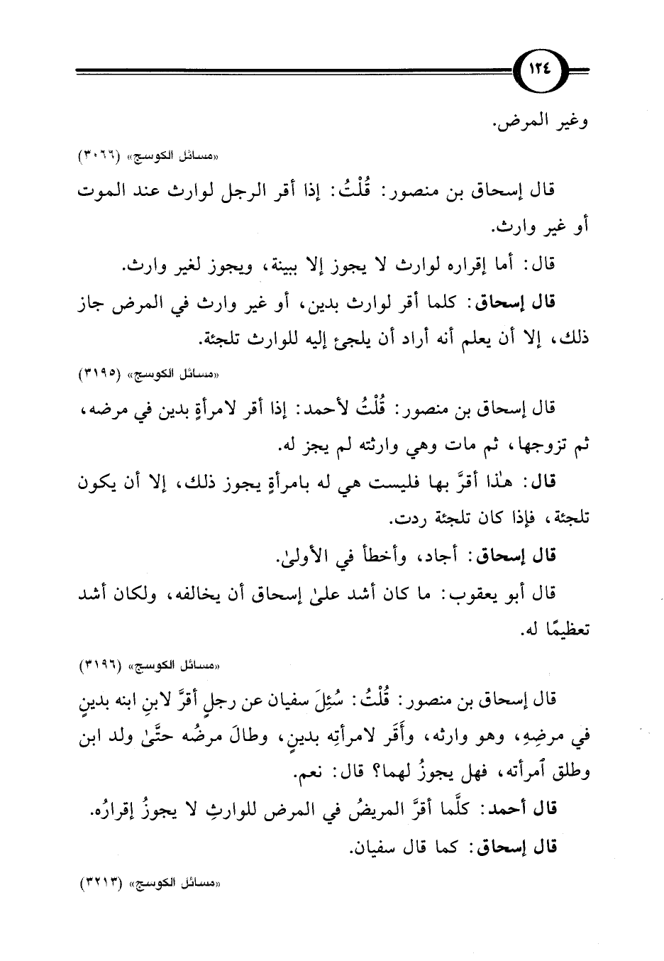 قال إسحاق بن منصور: قُلْتُ: سئِلَ سفيان عن رجلٍ أقرَّ لابنِ ابنه بدينٍ في مرضِهِ، وهو وارثه، وأَقَر لامرأتِه بدينٍ، وطالَ مرضُه حتَّى ولد ابن وطلق امرأته، فهل يجوزُ لهما؟ قال: نعم.