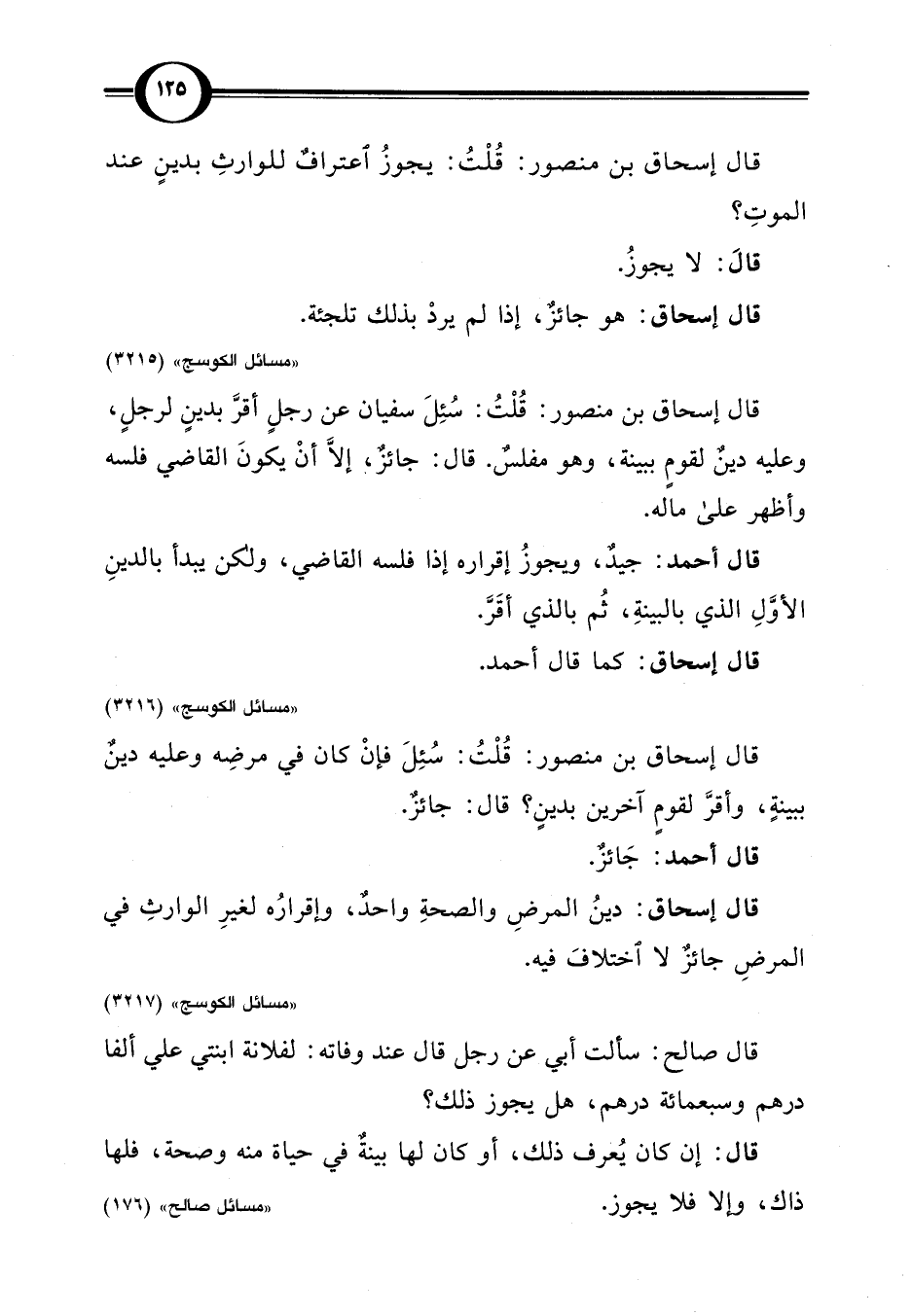 قال إسحاق بن منصور: قُلْتُ: يجوزُ اعترافٌ للوارثِ بدينٍ عند الموتِ؟