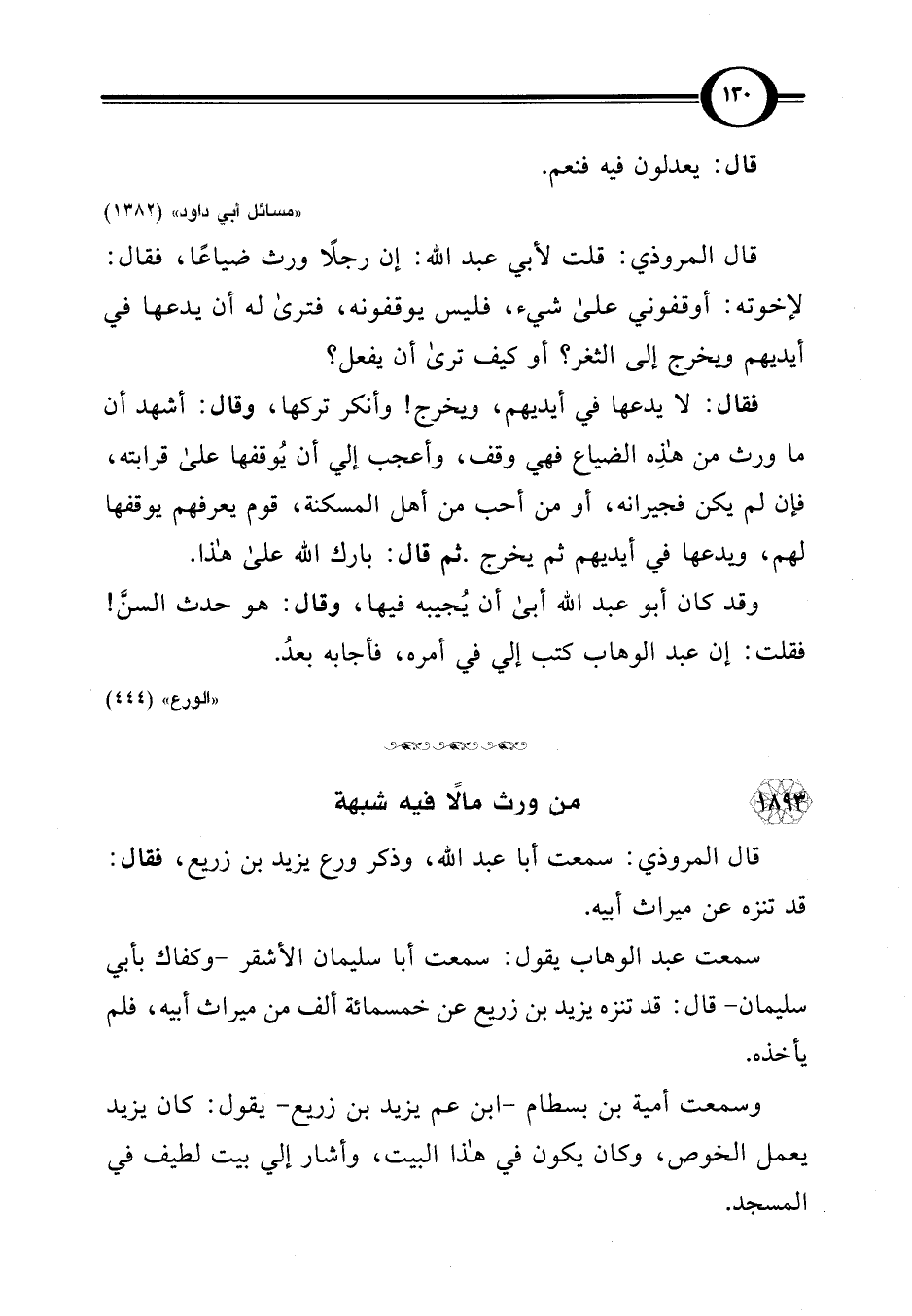 قال المروذي: قلت لأبي عبد اللَّه: إن رجلًا ورث ضياعًا، فقال: لإخوته: أوقفوني على شيء، فليس يوقفونه، فترى له أن يدعها في أيديهم ويخرج إلى الثغر؟ أو كيف ترى أن يفعل؟