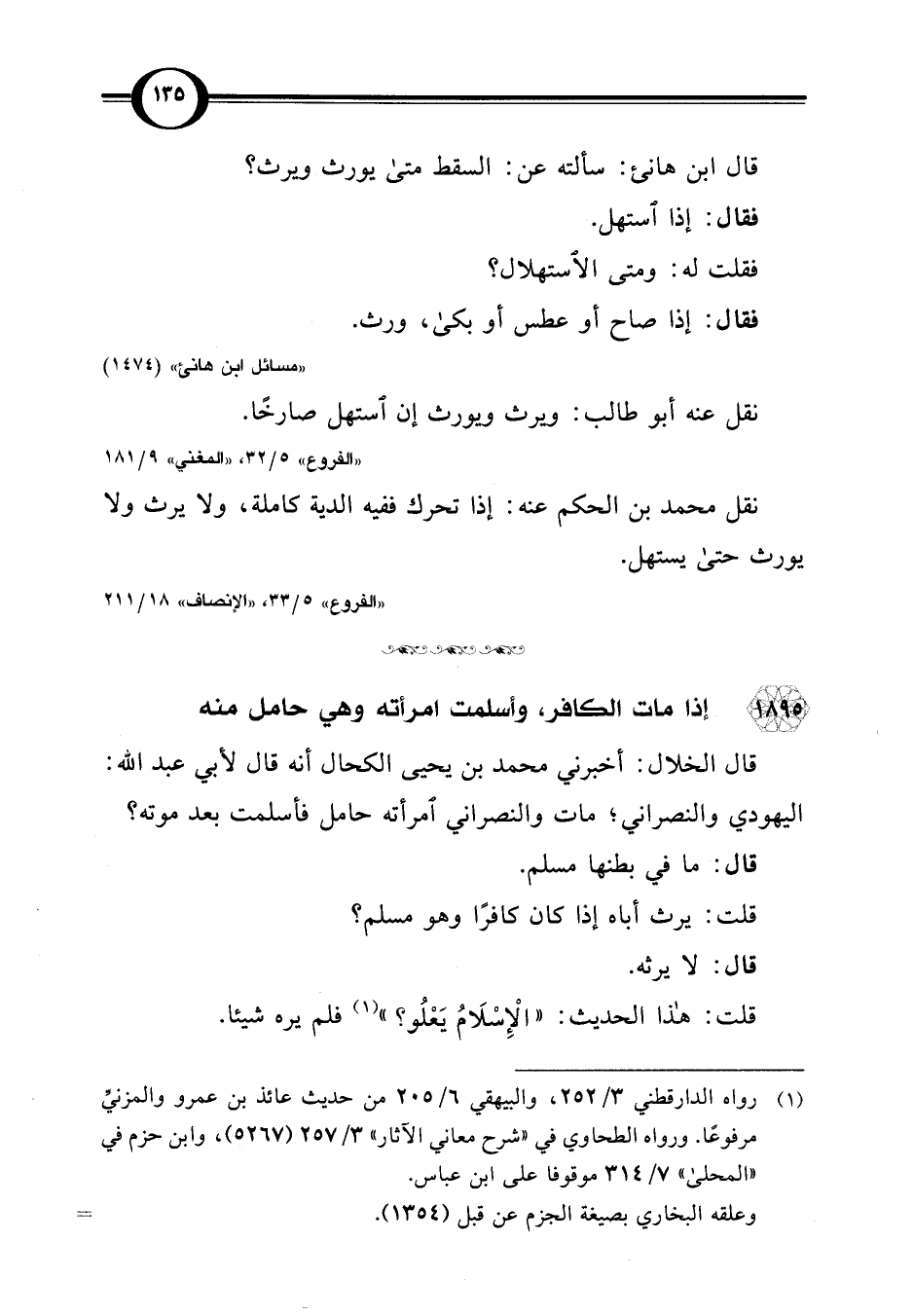 قال الخلال: أخبرني محمد بن يحيى الكحال أنه قال لأبي عبد اللَّه: اليهودي والنصراني؛ مات والنصراني امرأته حامل فأسلمت بعد موته؟