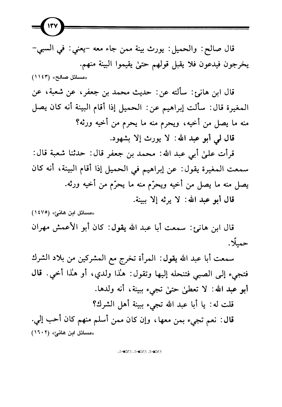 قال ابن هانئ: سألته عن: حديث محمد بن جعفر، عن شعبة، عن المغيرة قال: سألت إبراهيم عن: الحميل إذا أقام البينة أنه كان يصل منه ما يصل من أخيه، ويحرم منه ما يحرم من أخيه ورثه؟