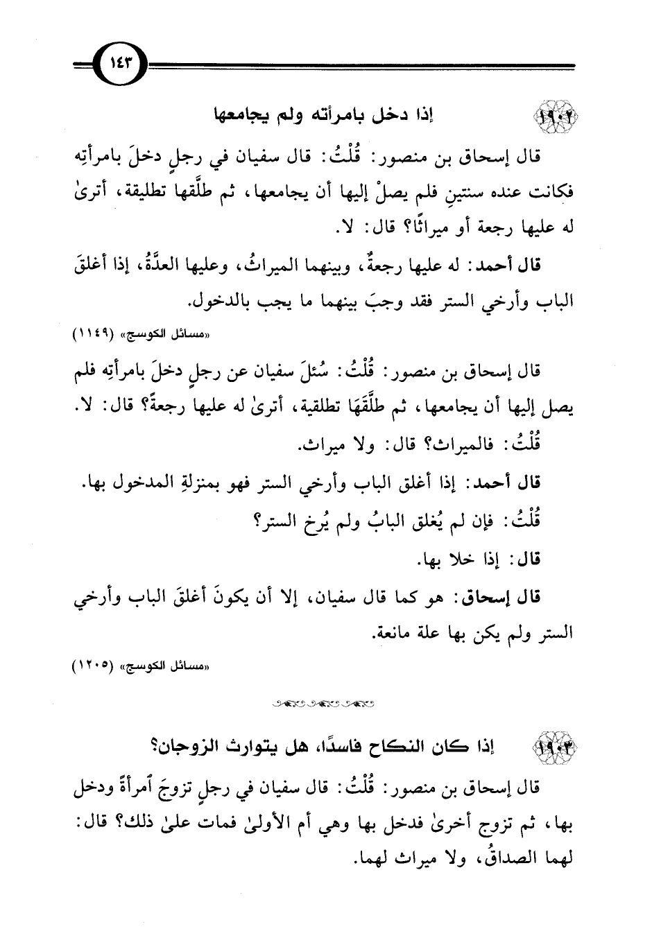 قال إسحاق بن منصور: قُلْتُ: قال سفيان في رجلٍ دخلَ بامرأتِه فكانت عنده سنتينِ فلم يصلْ إليها أن يجامعها، ثم طلَّقها تطليقة، أترى له عليها رجعة أو ميراثًا؟ قال: لا.
