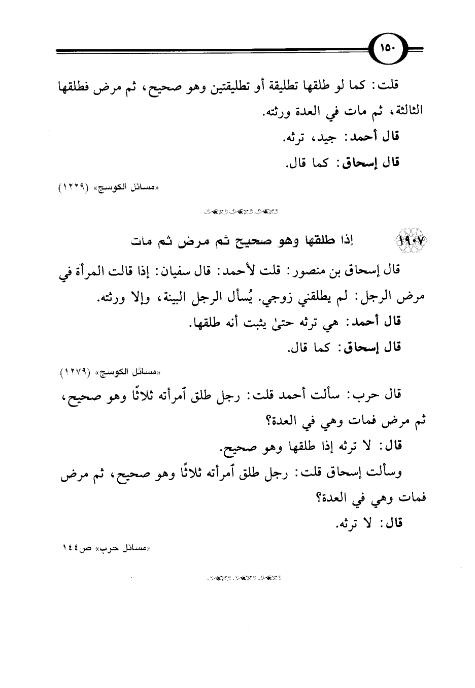 قال حرب: سألت أحمد قلت: رجل طلق امرأته ثلاثًا وهو صحيح، ثم مرض فمات وهي في العدة؟