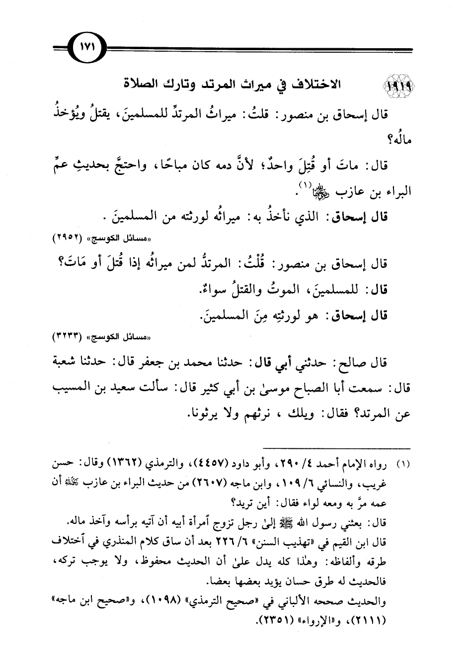 قال إسحاق بن منصور: قلتُ: ميراثُ المرتدِّ للمسلمينَ، يقتلُ ويُؤخذُ مالُه؟