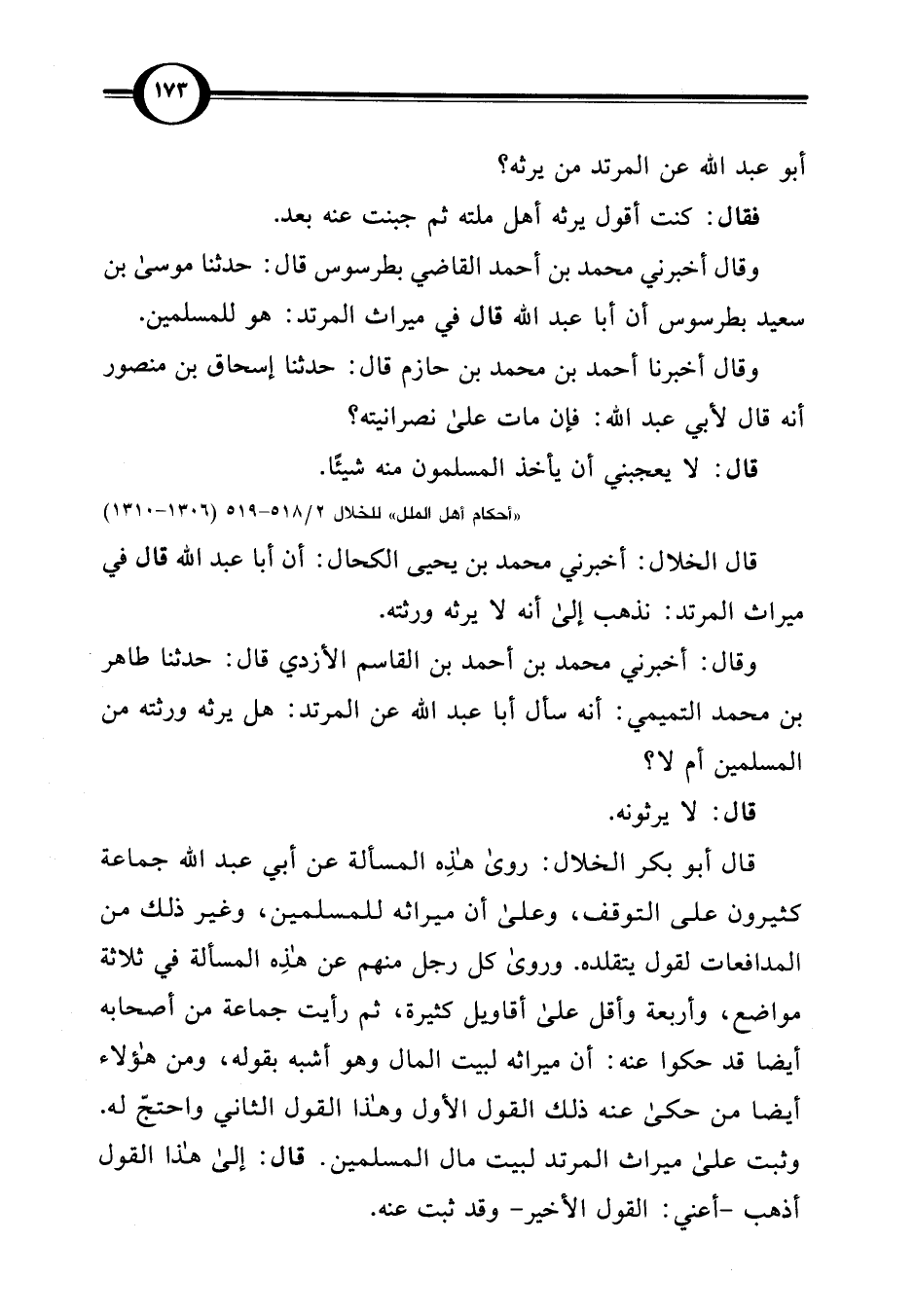 قال أبو بكر الخلال: روى هذِه المسألة عن أبي عبد اللَّه جماعة كثيرون على التوقف، وعلى أن ميراثه للمسلمين، وغير ذلك من المدافعات لقول يتقلده. وروى كل رجل منهم عن هذِه المسألة في ثلاثة مواضع، وأربعة وأقل على أقاويل كثيرة، ثم رأيت جماعة من أصحابه أيضا قد حكوا عنه: أن ميراثه لبيت المال وهو أشبه بقوله، ومن هؤلاء أيضا من حكى عنه ذلك القول الأول وهذا القول الثاني واحتجّ له. وثبت على ميراث المرتد لبيت مال المسلمين. قال: إلى هذا القول أذهب -أعني: القول الأخير- وقد ثبت عنه.