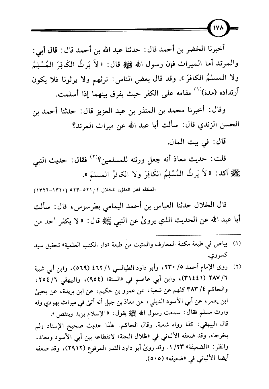 وقال: أخبرنا محمد بن المنذر بن عبد العزيز قال: حدثنا أحمد بن الحسن الزندي قال: سألت أبا عبد اللَّه عن ميراث المرتد؟