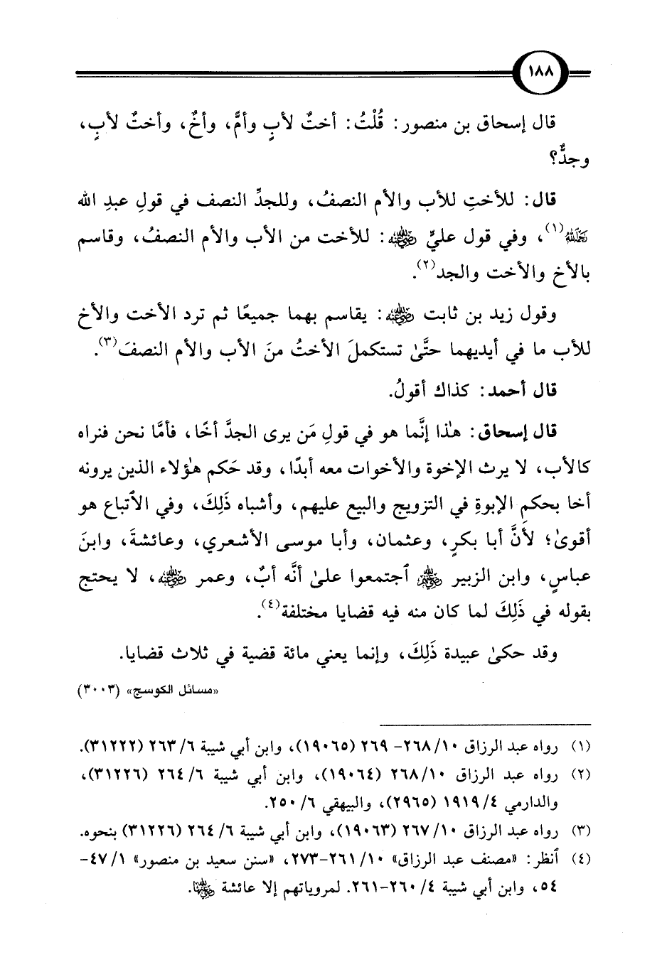 قال إسحاق: هذا إنَّما هو في قولِ مَن يرى الجدَّ أخًا، فأمَّا نحن فنراه كالأب، لا يرث الإخوة والأخوات معه أبدًا، وقد حَكم هؤلاء الذين يرونه أخا بحكمِ الإبوةِ في التزويج والبيع عليهم، وأشباه ذَلِكَ، وفي الاتباع هو أقوى؛ لأنَّ أبا بكرٍ، وعثمان، وأبا موسى الأشعري، وعائشةَ، وابنَ عباسٍ، وابن الزبير -رضي اللَّه عنه- اجتمعوا على أنَّه أبٌ، وعمر -رضي اللَّه عنه-، لا يحتج بقوله في ذَلِكَ لما كان منه فيه قضايا مختلفة (¬4).