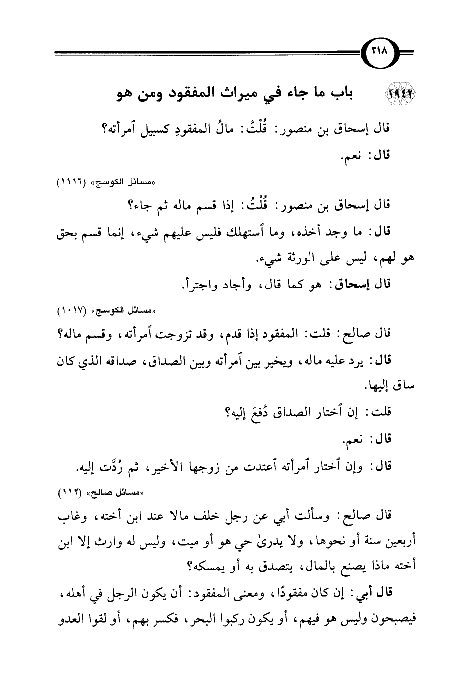 قال إسحاق بن منصور: قُلْتُ: مالُ المفقودِ كسبيل امرأته؟