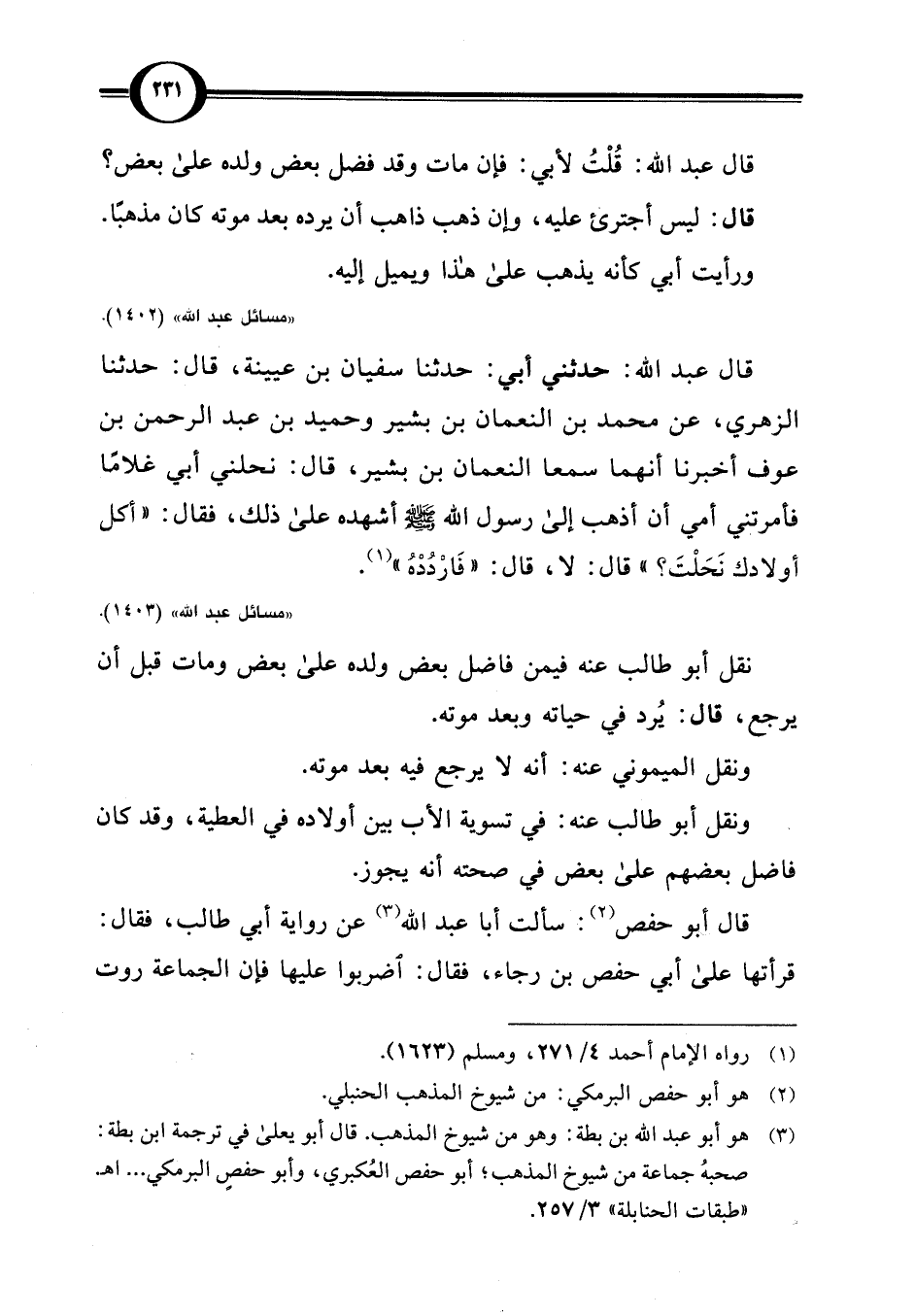 قال عبد اللَّه: حدثني أبي: حدثنا سفيان بن عيينة، قال: حدثنا الزهري، عن محمد بن النعمان بن بشير وحميد بن عبد الرحمن بن عوف أخبرنا أنهما سمعا النعمان بن بشير، قال: نحلني أبي غلامًا فأمرتني أمي أن أذهب إلى رسول اللَّه -صلى اللَّه عليه وسلم- أشهده على ذلك، فقال: "أكل أولادك نَحَلْتَ؟ " قال: لا، قال: "فَارْدُدْهُ" (¬1).