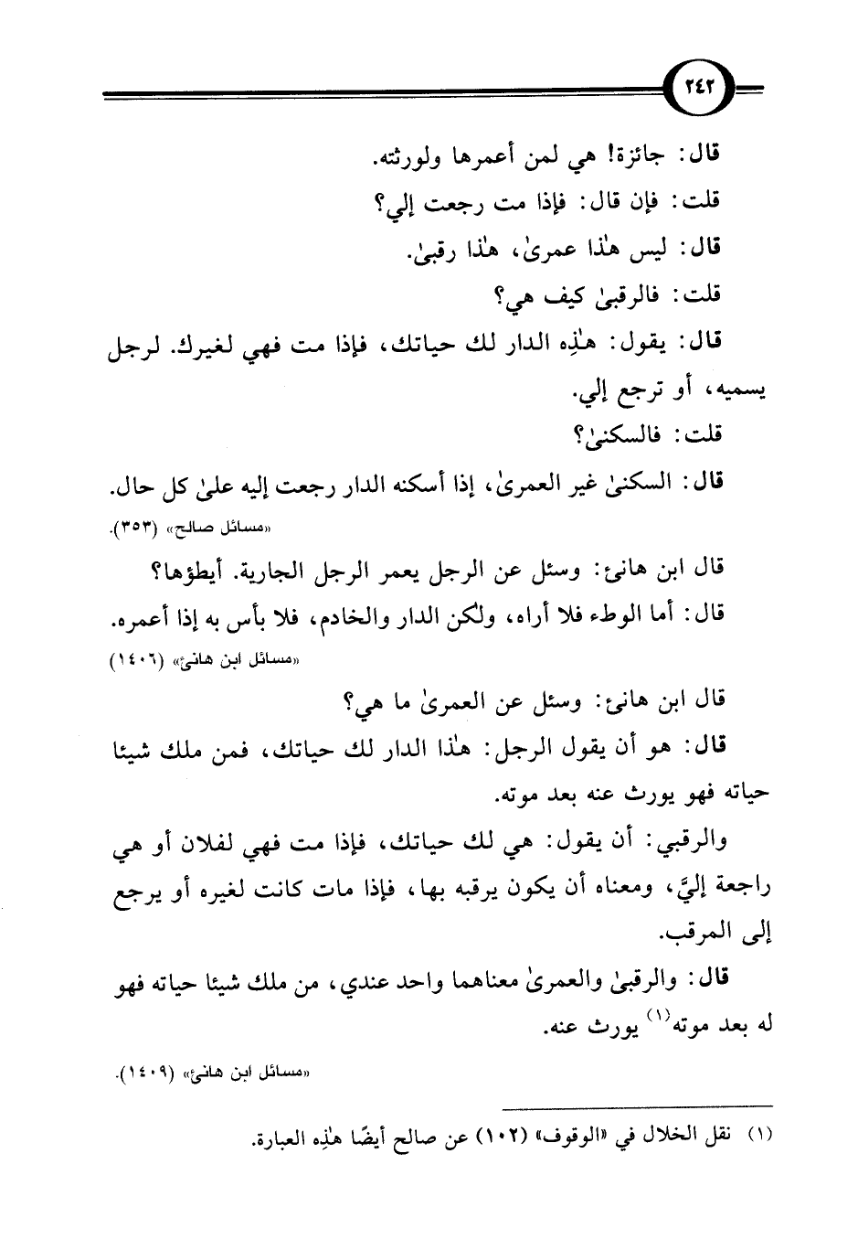 قال ابن هانئ: وسئل عن العمرى ما هي؟