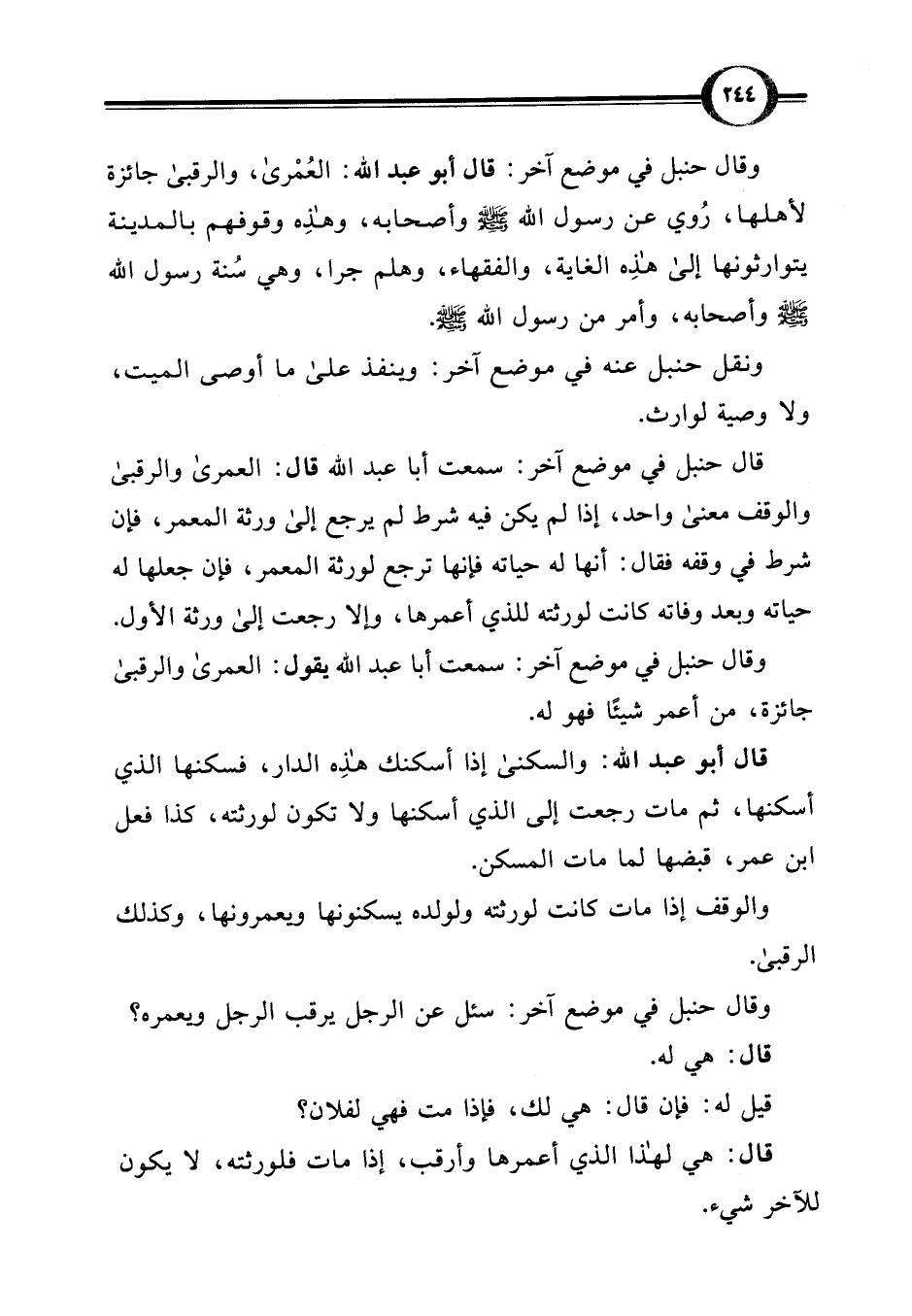 وقال حنبل في موضع آخر: قال أبو عبد اللَّه: العُمْرى، والرقبى جائزة لأهلها، رُوي عن رسول اللَّه -صلى اللَّه عليه وسلم- وأصحابه، وهذِه وقوفهم بالمدينة يتوارثونها إلى هذِه الغاية، والفقهاء، وهلم جرا، وهي سنة رسول اللَّه -صلى اللَّه عليه وسلم - وأصحابه، وأمر من رسول اللَّه -صلى اللَّه عليه وسلم-.