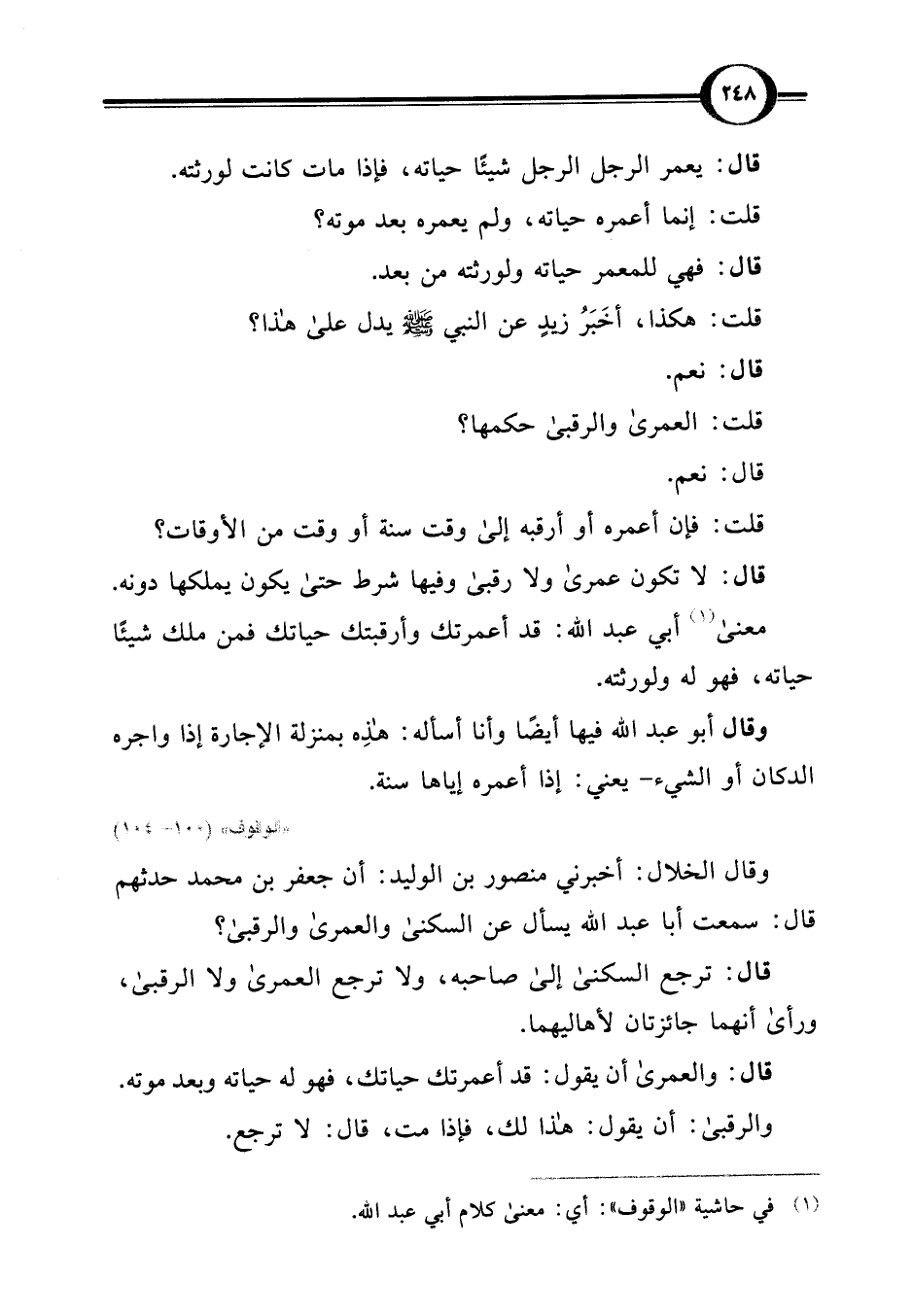 وقال الخلال: أخبرني منصور بن الوليد: أن جعفر بن محمد حدثهم قال: سمعت أبا عبد اللَّه يسأل عن السكنى والعمرى والرقبى؟