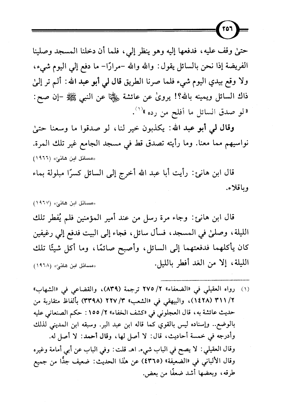 حتى وقف عليه، فدفعها إليه وهو ينظر إلى، فلما أن دخلنا المسجد وصلينا الفريضة إذا نحن بالسائل يقول: واللَّه واللَّه -مرارًا- ما دفع إلى اليوم شيء، ولا وقع بيدي اليوم شيء فلما صرنا الطريق قال لي أبو عبد اللَّه: ألم تر إلى ذاك السائل ويمينه باللَّه؟ ! يروى عن عائشة -رضي اللَّه عنها- عن النبي -صلى اللَّه عليه وسلم- إن صح: "لو صدق السائل ما أفلح من رده" (¬1).