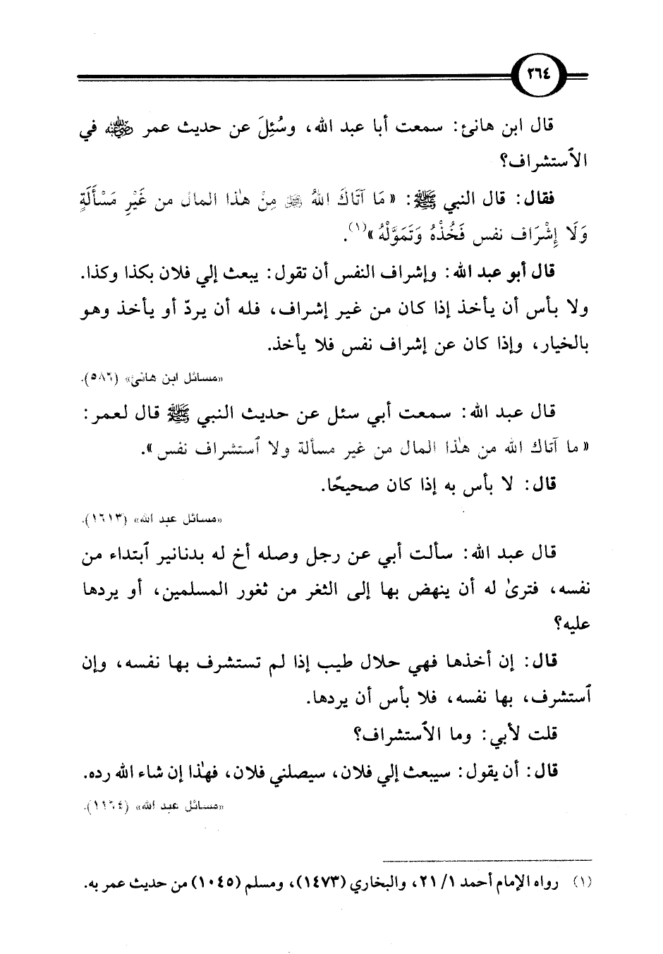 قال عبد اللَّه: سمعت أبي سئل عن حديث النبي -صلى اللَّه عليه وسلم- قال لعمر: "ما آتاك اللَّه من هذا المال من غير مسألة ولا استشراف نفس".