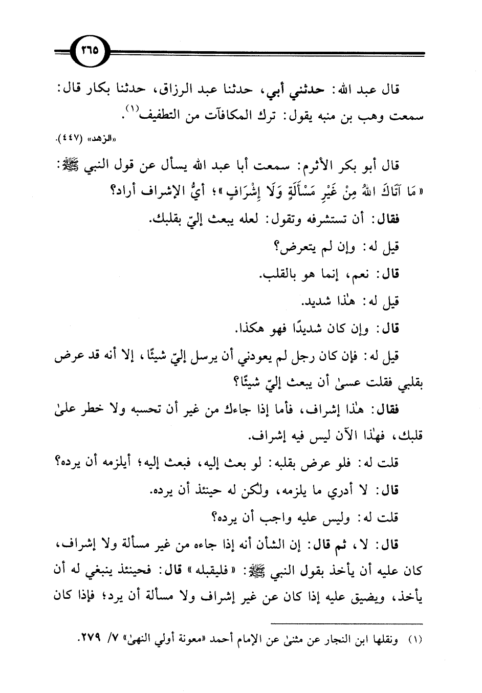 قال أبو بكر الأثرم: سمعت أبا عبد اللَّه يسأل عن قول النبي -صلى اللَّه عليه وسلم-: "مَا آتَاكَ اللَّهُ مِن غَيْرِ مَسْأَلَةٍ وَلَا إِشْرَافٍ"؛ أيُّ الإشراف أراد؟