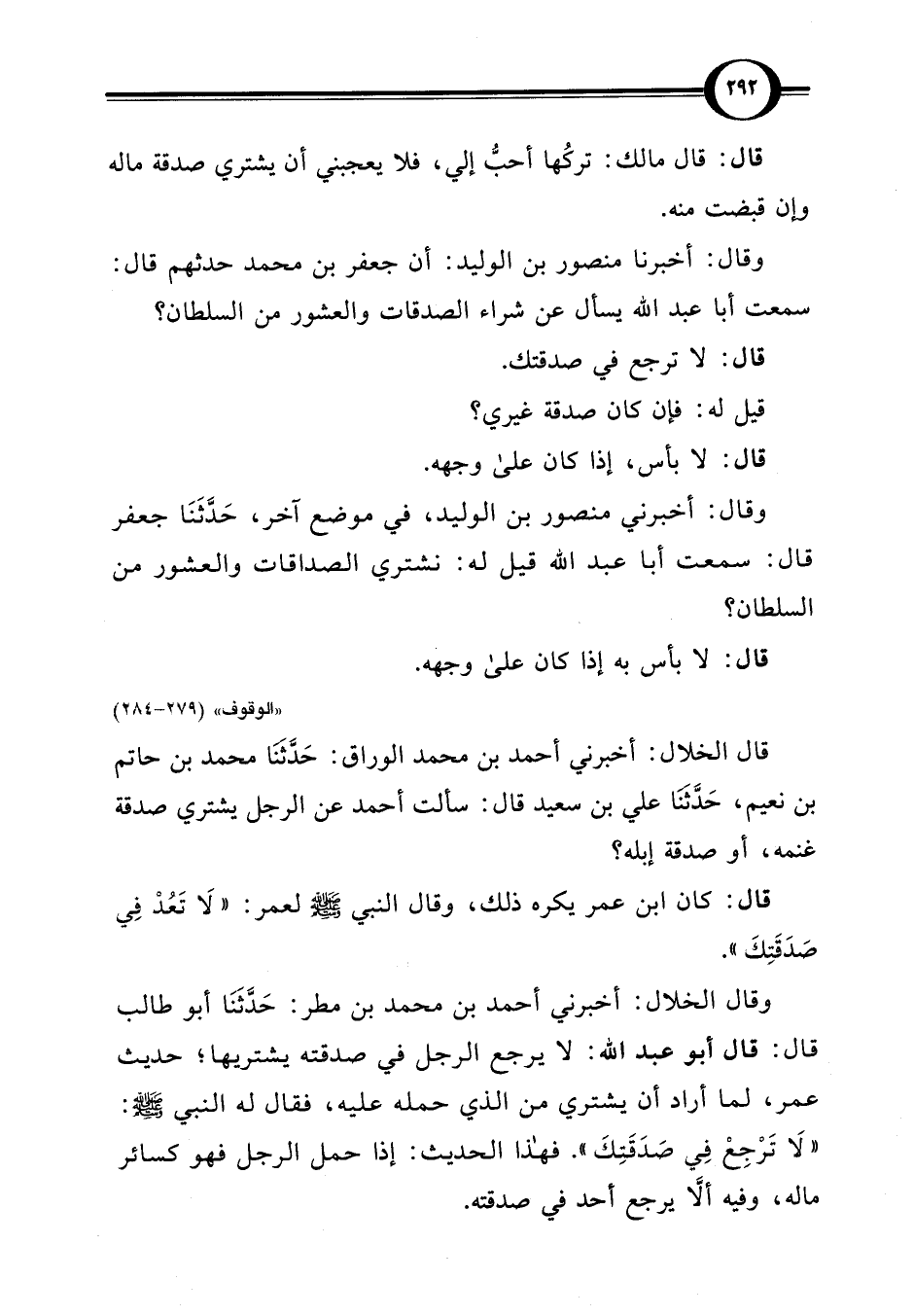 وقال: أخبرنا منصور بن الوليد: أن جعفر بن محمد حدثهم قال: سمعت أبا عبد اللَّه يسأل عن شراء الصدقات والعشور من السلطان؟