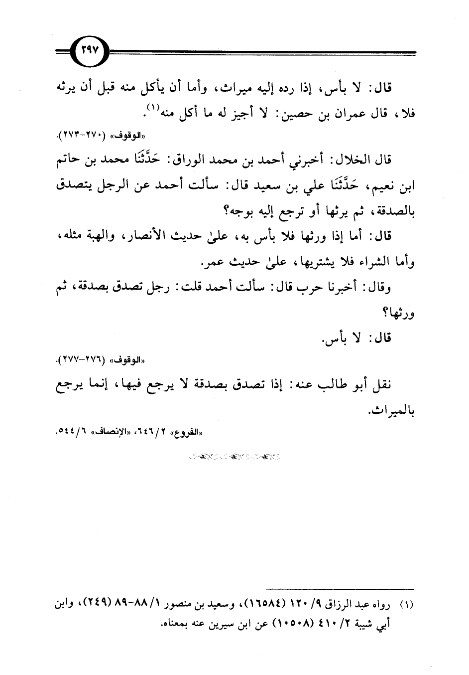 قال الخلال: أخبرني أحمد بن محمد الوراق: حَدَّثنَا محمد بن حاتم ابن نعيم، حدثنا علي بن سعيد قال: سألت أحمد عن الرجل يتصدق بالصدقة، ثم يرثها أو ترجع إليه بوجه؟