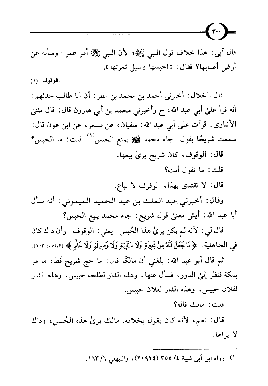 ثم قال أبو عبد اللَّه: بلغني أن مالكًا قال: ما حج شريح قط، ما مر بمكة فنظر إلى الدور، فسأل عنها، وهذه الدار لطلحة حبيس، وهذه الدار لفلان حبيس، وهذه الدار لفلان حبيس.