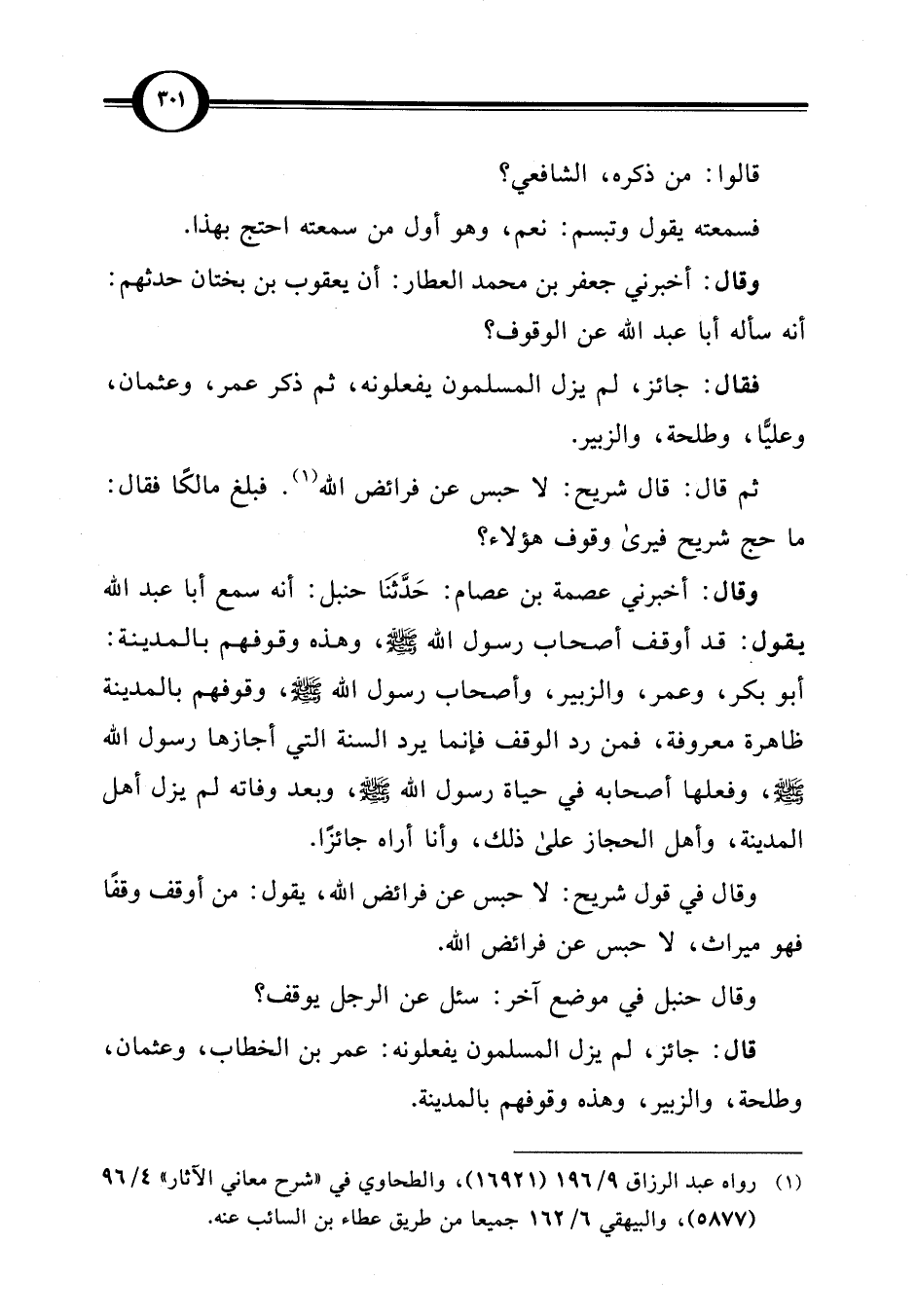 وقال: أخبرني عصمة بن عصام: حَدَّثنَا حنبل: أنه سمع أبا عبد اللَّه يقول: قد أوقف أصحاب رسول اللَّه -صلى اللَّه عليه وسلم-، وهذه وقوفهم بالمدينة: أبو بكر، وعمر، والزبير، وأصحاب رسول اللَّه -صلى اللَّه عليه وسلم-، وقوفهم بالمدينة ظاهرة معروفة، فمن رد الوقف فإنما يرد السنة التي أجازها رسول اللَّه -صلى اللَّه عليه وسلم-، وفعلها أصحابه في حياة رسول اللَّه -صلى اللَّه عليه وسلم-، وبعد وفاته لم يزل أهل المدينة، وأهل الحجاز على ذلك، وأنا أراه جائزًا.