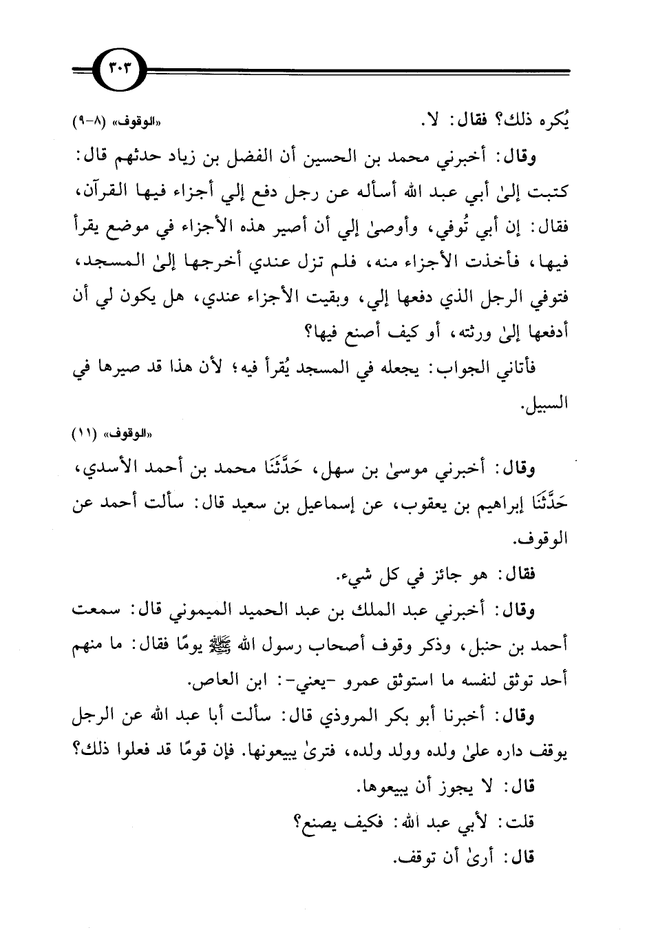وقال: أخبرني موسى بن سهل، حدثنا محمد بن أحمد الأسدي، حَدَّثنَا إبراهيم بن يعقوب، عن إسماعيل بن سعيد قال: سألت أحمد عن الوقوف.