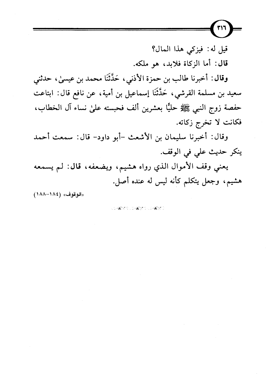 وقال: أخبرنا طالب بن حمزة الأذني، حَدَّثنَا محمد بن عيسى، حدثني سعيد بن مسلمة القرشي، حَدَّثنَا إسماعيل بن أمية، عن نافع قال: ابتاعت حفصة زوج النبي -صلى اللَّه عليه وسلم- حليًّا بعشرين ألف فحبسته على نساء آل الخطاب، فكانت لا تخرج زكاته.