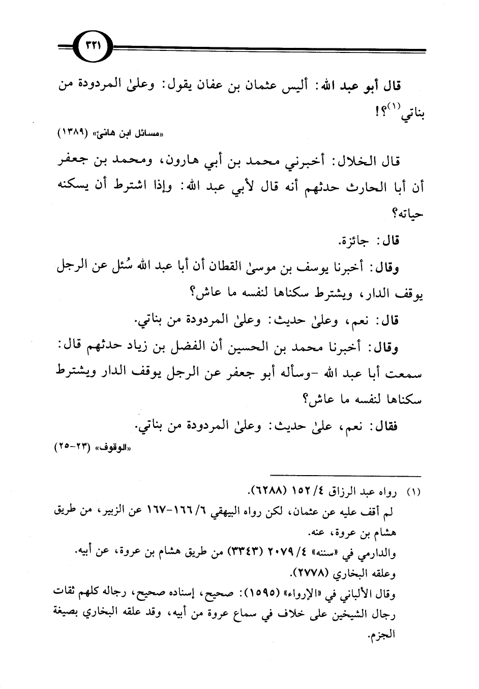 قال أبو عبد اللَّه: أليس عثمان بن عفان يقول: وعلى المردودة من بناتي (¬1)؟ !
